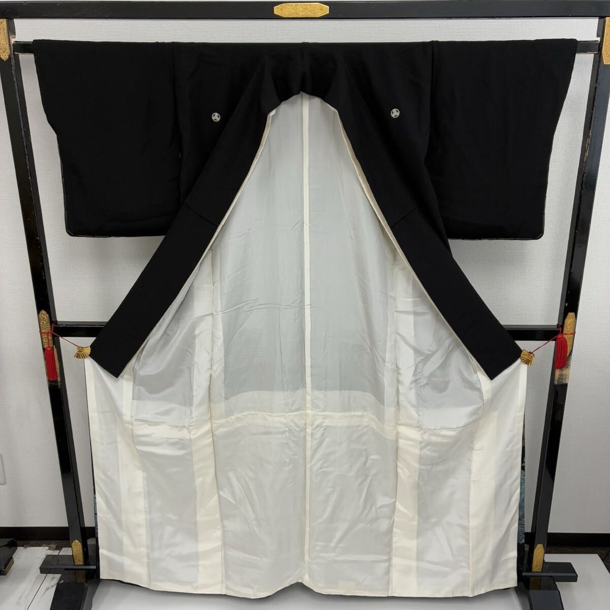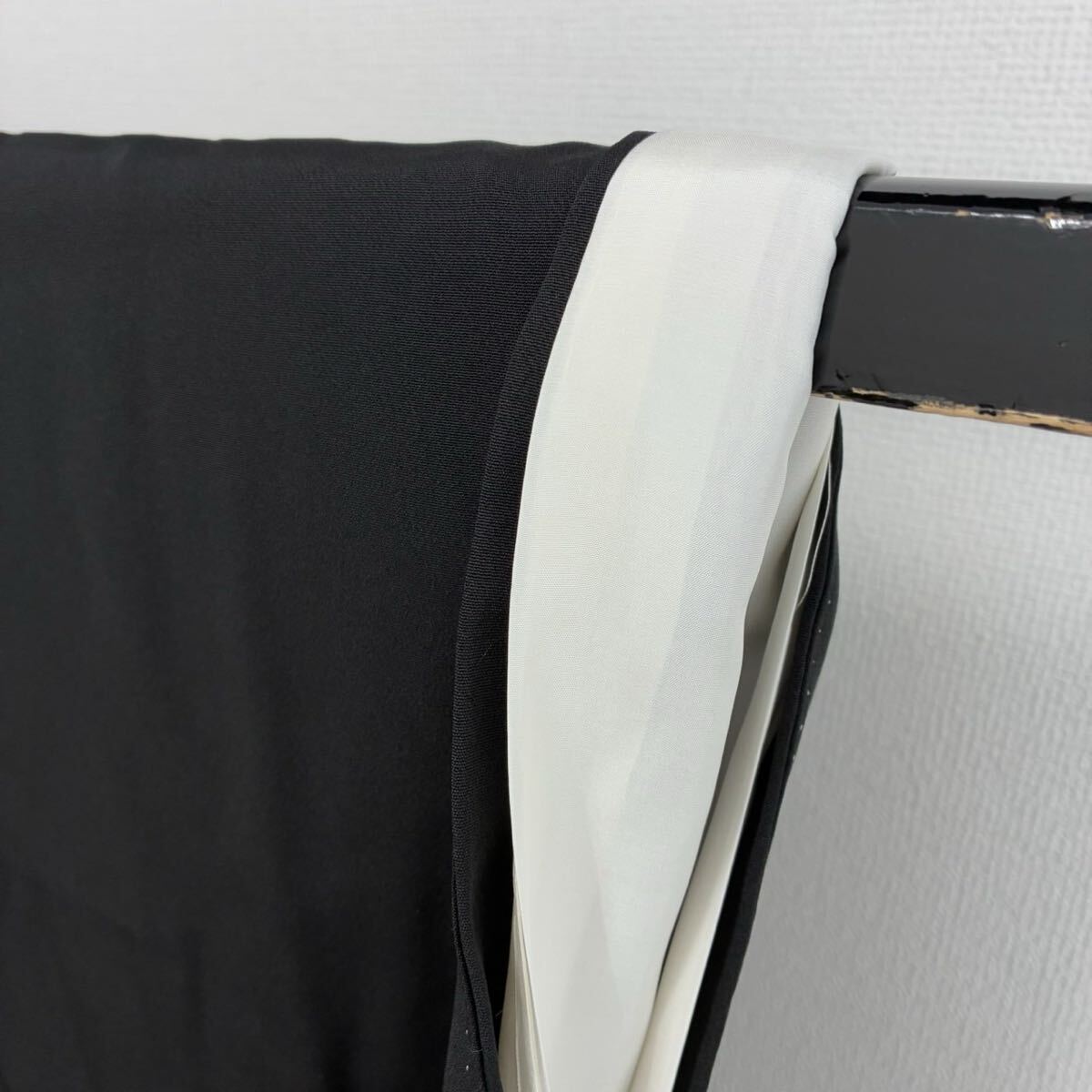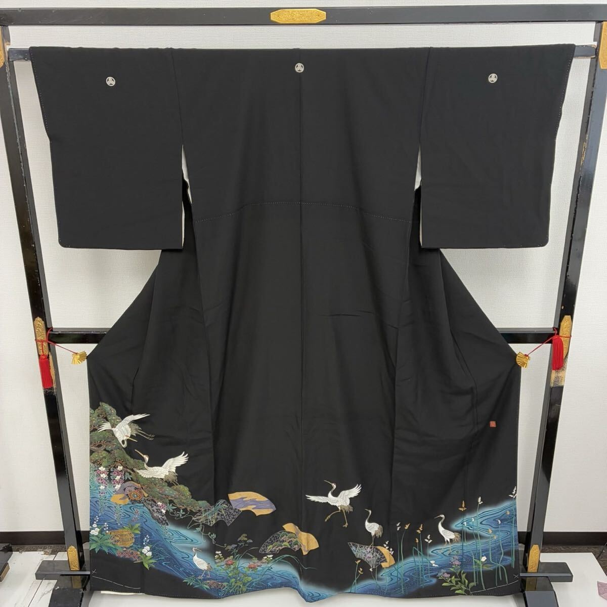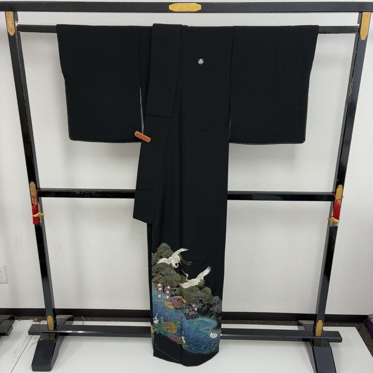 【楓】ビーズの輝き 珍品 黒留袖 正絹 流水 地紙花 鶴 比翼 袷 着物 KK-1090
