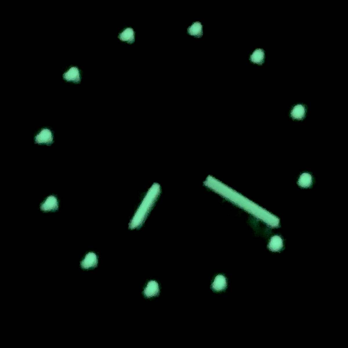 * 文字盤: きれいな状態です。夜光の針とインデックスは適切に光ります(写真参照)