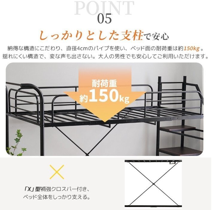 システムベット ロフトベッド シングル デスク付き コンセント付き 収納付き ハンガーポール付き 耐荷重150kg 北欧風 スチール 耐震
