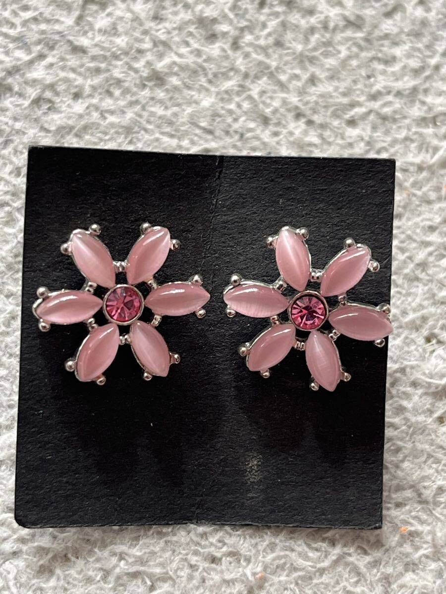 ピンクの花デザインのスタッドピアス、華やかな印象を与えます。