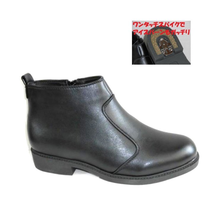 PMSのプレーントウブーツ。アッパーは防水加工が施されていますので雨の日も安心です(生活防水)。 ファスナーにはガゼットが付いていて水の浸入を防ぎます。アウトソールには必要な時は簡単に取り出せるワンタッチスパイクを装着しているのでアイスバーンでの防滑対策も万全です。