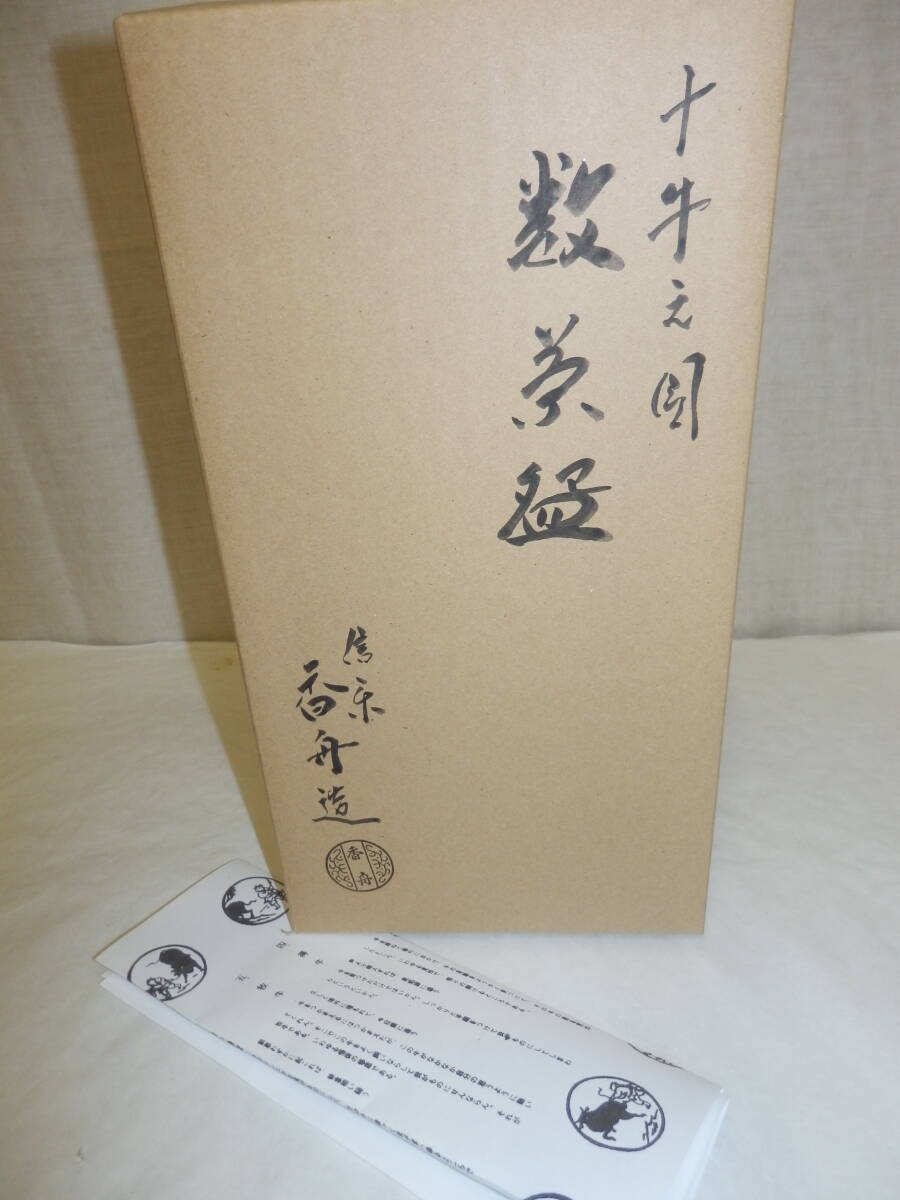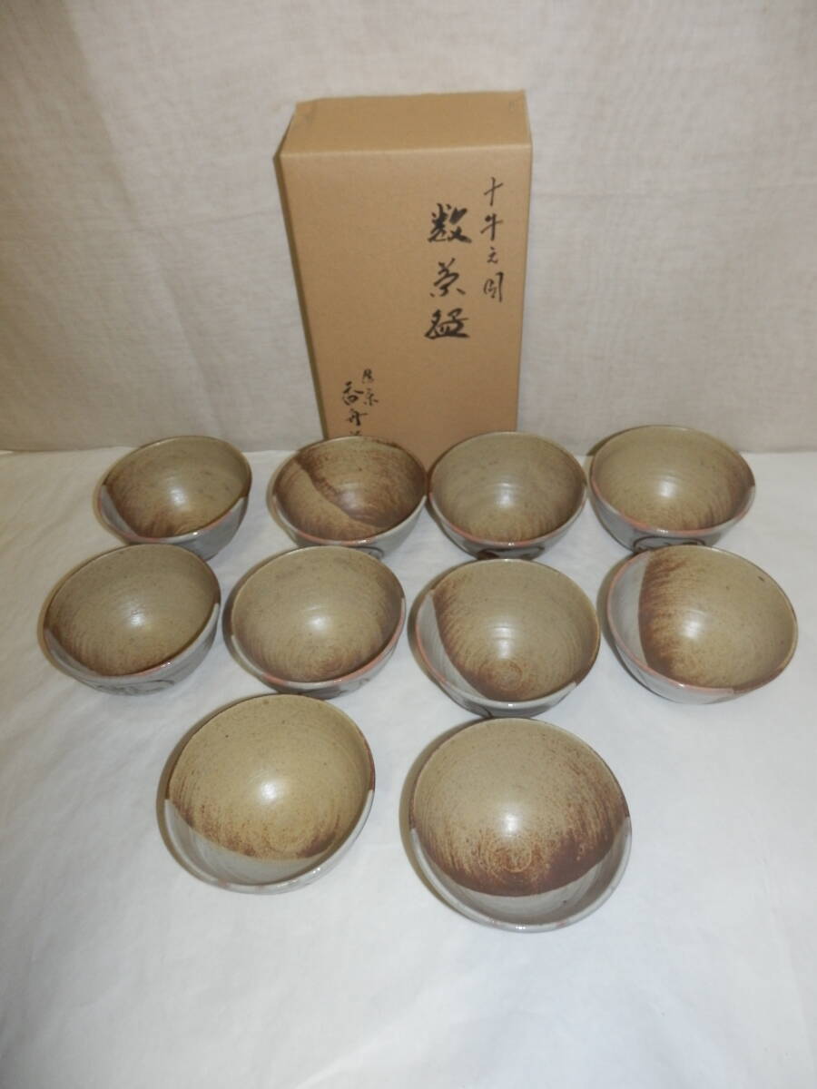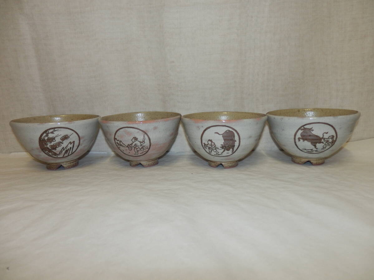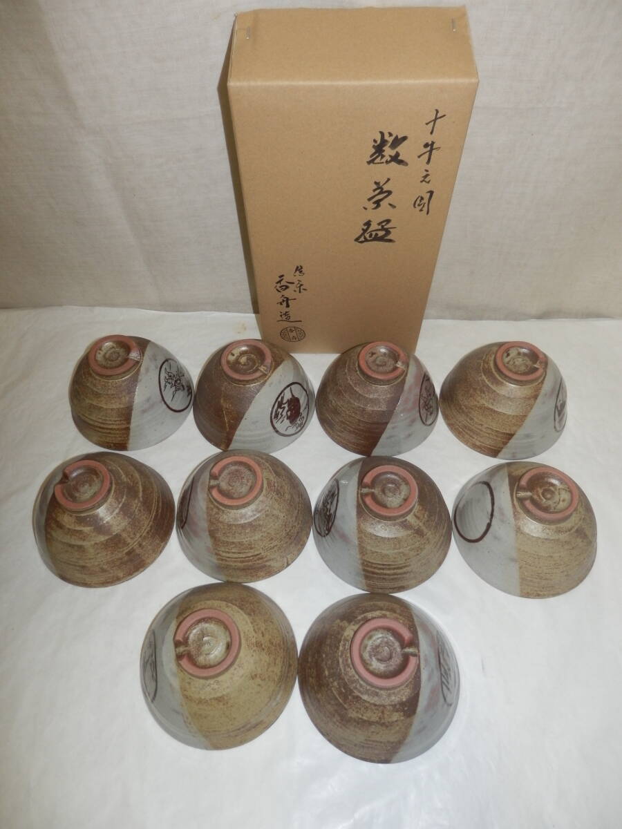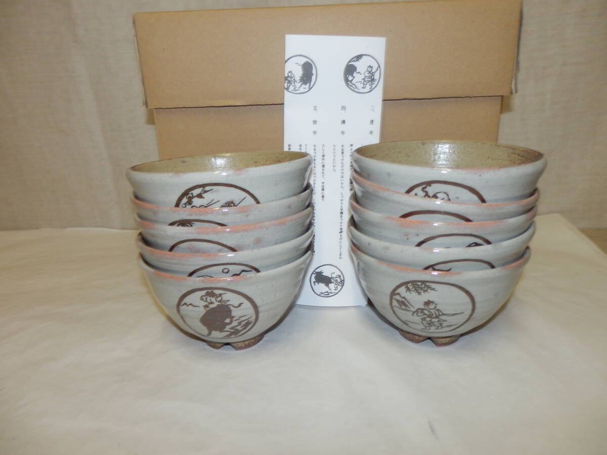 「新品・茶道具」 信楽焼の西尾香舟さんの数茶碗{10碗}です。 十牛之図です。 径約12.2cm 高さ 7.3cm 高台の横に香舟の印有。 紙共箱。 どうぞ宜しく。 「1尋牛(じんぎゅう)2見跡(けんぜき)3見牛(けんぎゅう)4得牛(とくぎゅう)5牧牛(ぼくぎゅう)6騎牛帰家(きぎゅうきか)7忘牛存人(ぼうぎゅうぞんじん)8人牛倶忘(じんぎゅうぐぼう)9返本還源(へんぽんかんげん)10入垂手(にってんすいしゅ)」