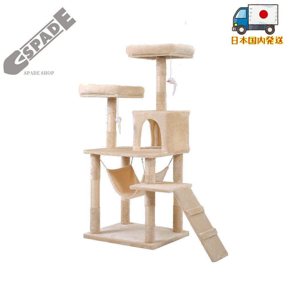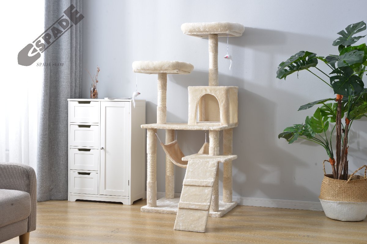 【国内発送】キャットタワー 据え置き ハンモック 麻紐 全高145cm 【ベージュ】