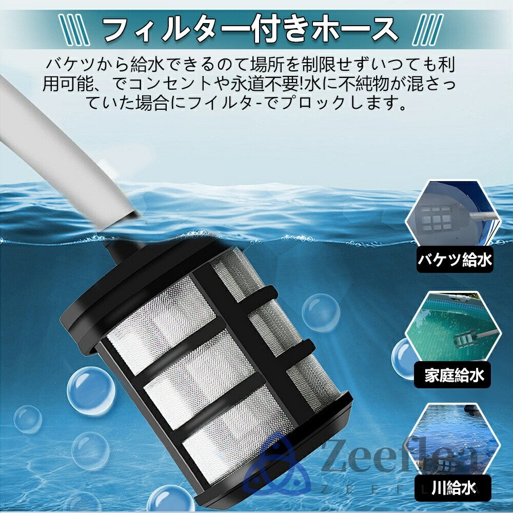 このワイヤレス充電式の高圧洗浄機は5段バッテリー1.5Ahのバッテリーを搭載していますので、市販品より2倍バッテリーを持ちます、ご使用中に電池量不足の心配がなく、楽々ご愛車を洗えます。フルまで充電したら最大1時間まで連続的に使えます(初めてご使用する前にバッテリーをフルまで充電してください)、頻繁に充電の手間が要らなく、電池を購入するお金も節約できます。供水には、フィルターが付いたホースを水が入ったタンクに入れて、簡単に給水できます。