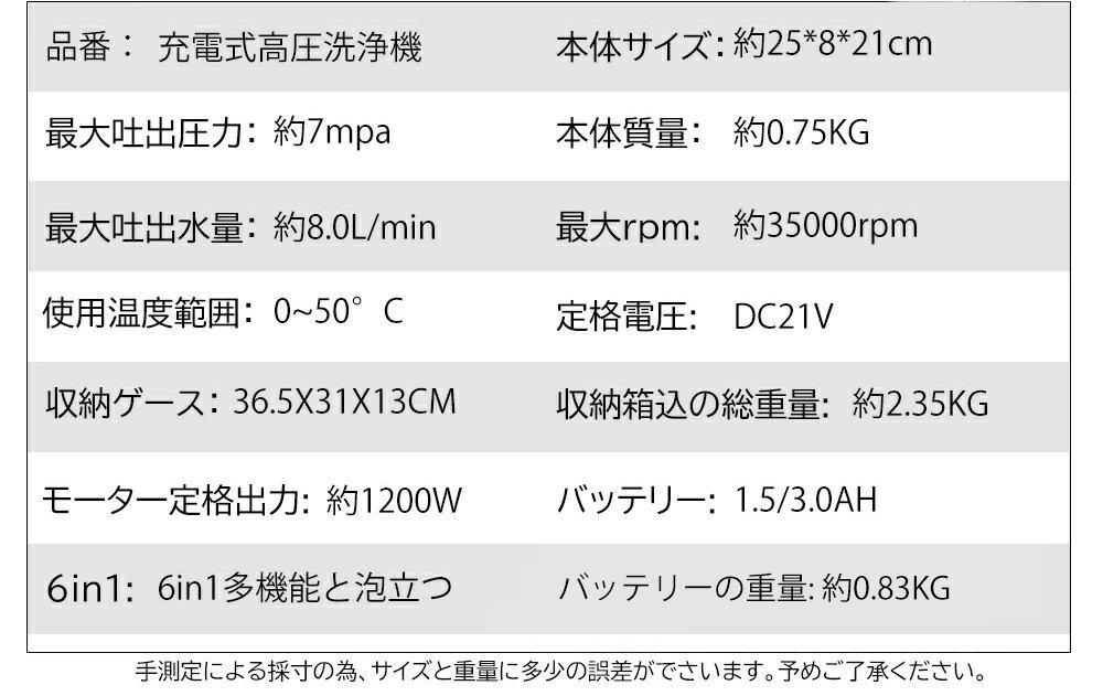 新しくアップグレードされたブラシレス高性能純銅モーターを搭載しており、強力な安定性と耐久性と強力なパワーの効率を向上されます。それに過電流保護、過電圧保護、過熱保護、充放電保護、アップグレードされた高効率プランジャーブースターポンプを取り付けています、駆動力は450ワットで、強力な圧力と安定して稼働できて、市販品より随分長持ち、頑固な汚れでも綺麗に洗えます。