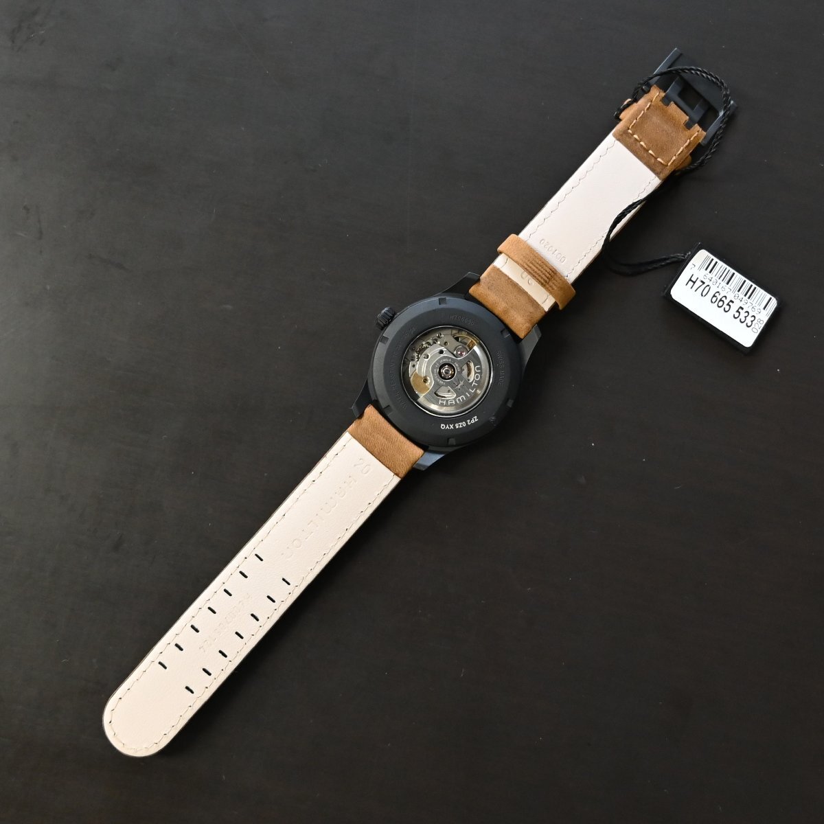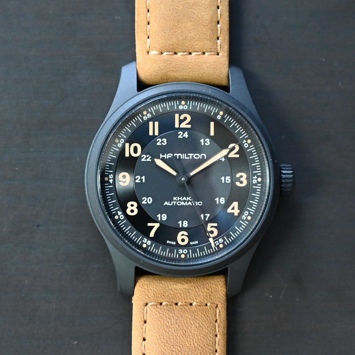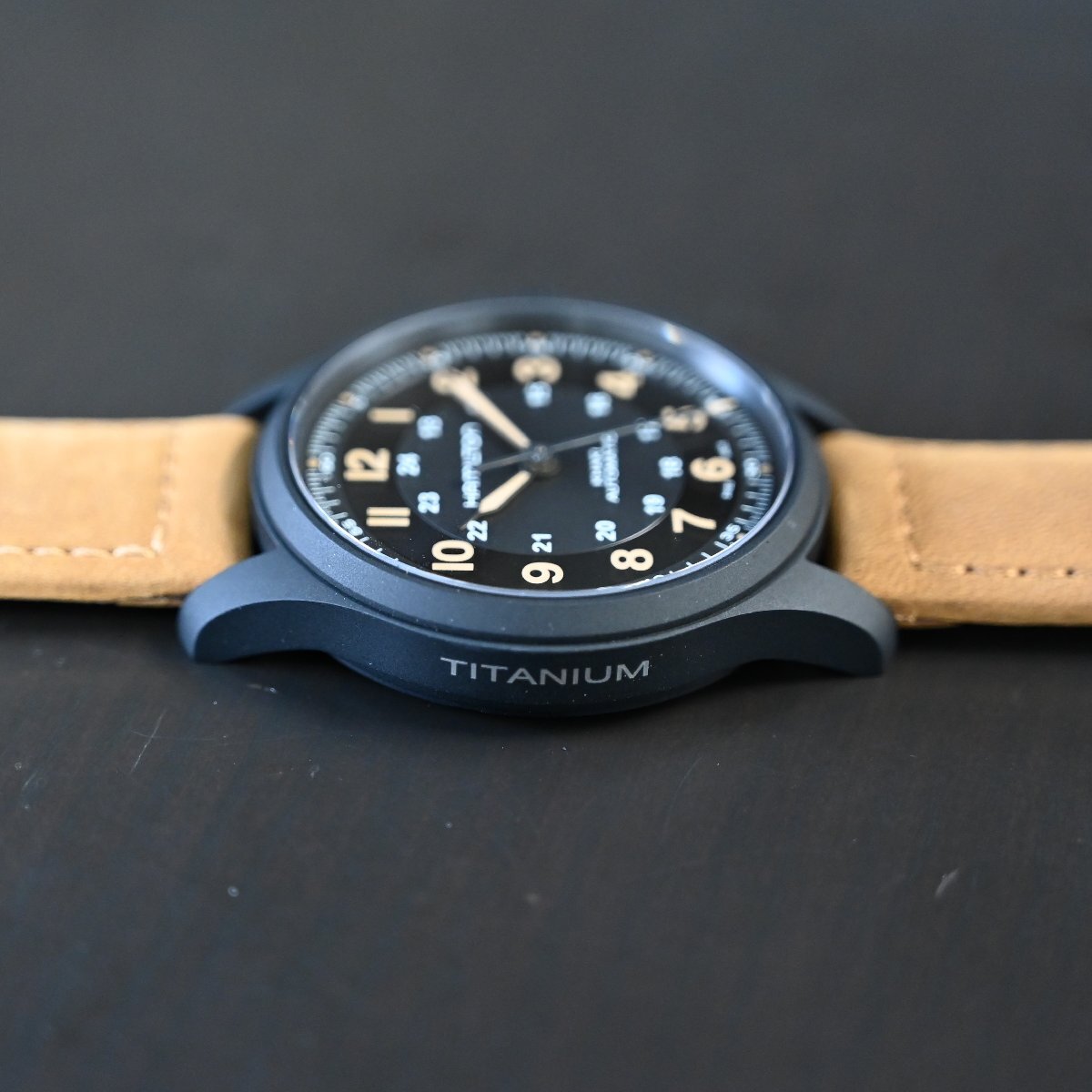 ハミルトンで人気のカーキフィールドのチタン ニヴァクロン製ヒゲゼンマイ搭載の80時間パワーリザーブ チタン製 100メートル防水 など かなりコスパの高いモデル 日差は平置きでプラス2秒程 新品未使用品の案内