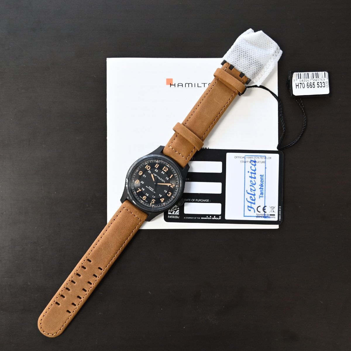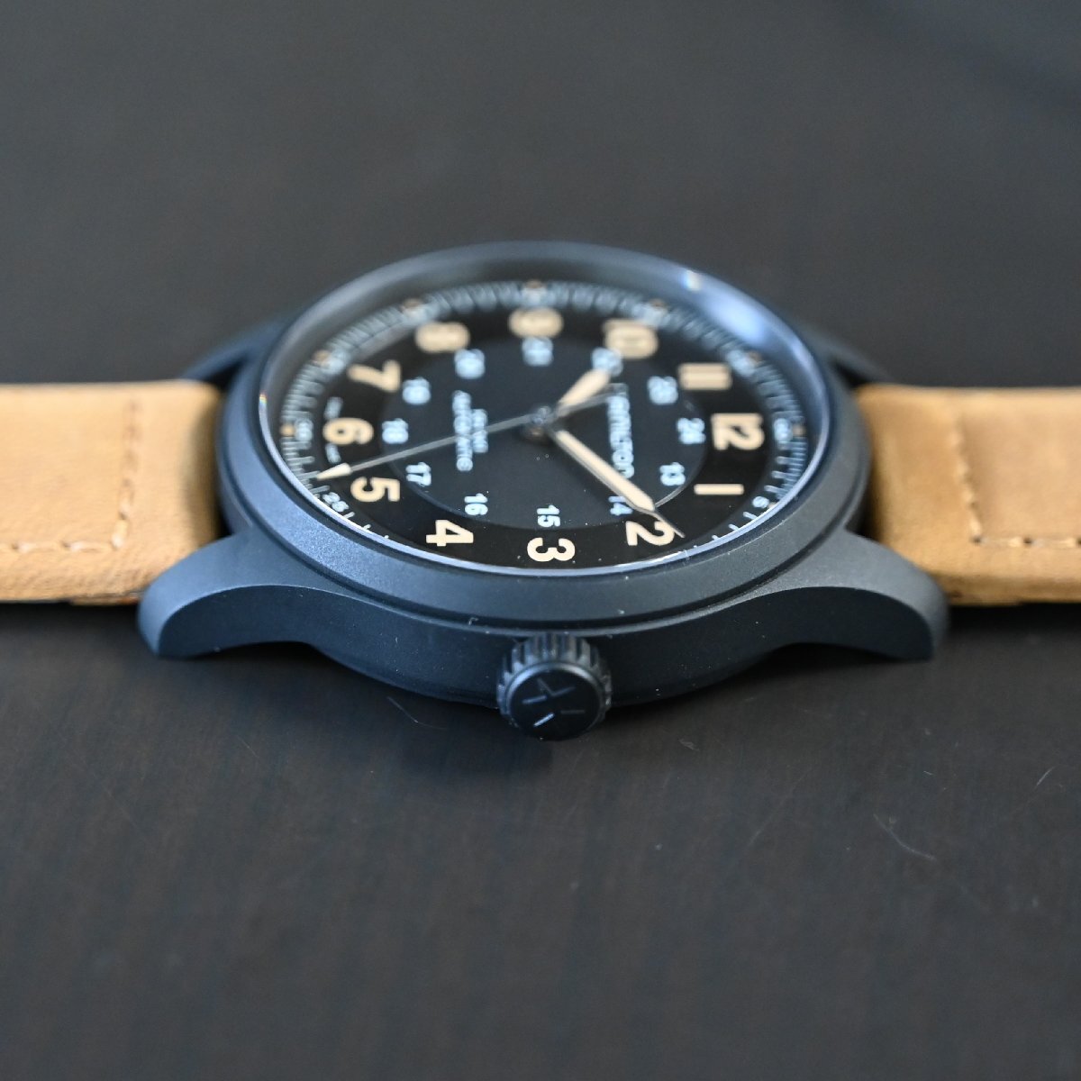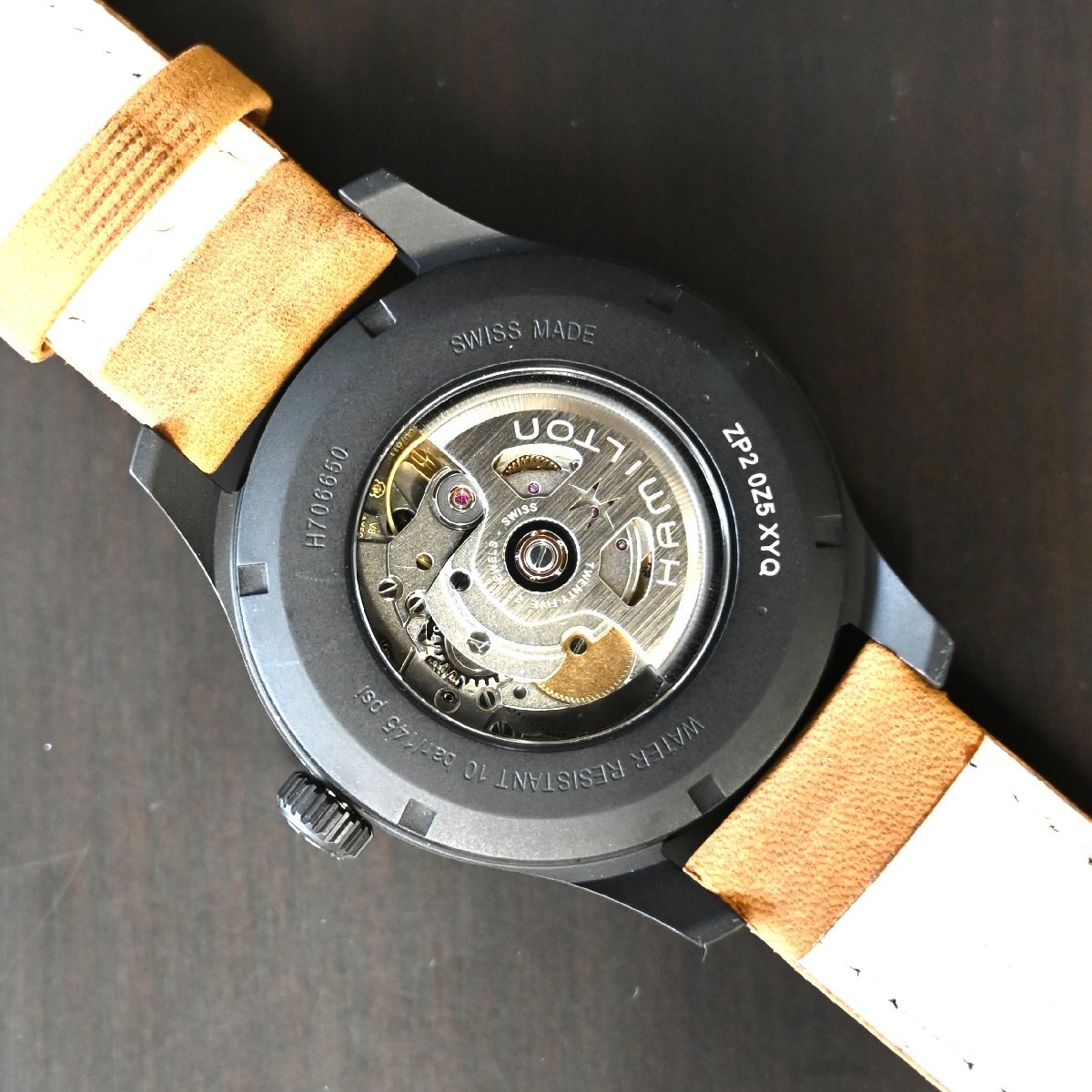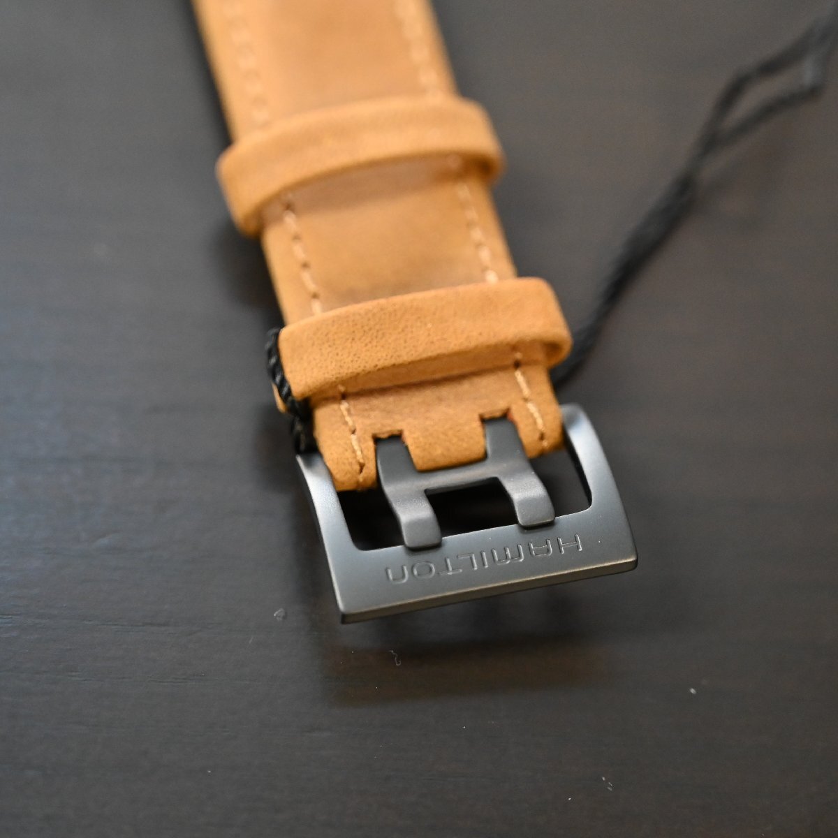 ハミルトンで人気のカーキフィールドのチタン ニヴァクロン製ヒゲゼンマイ搭載の80時間パワーリザーブ チタン製 100メートル防水 など かなりコスパの高いモデル 日差は平置きでプラス2秒程 新品未使用品の案内