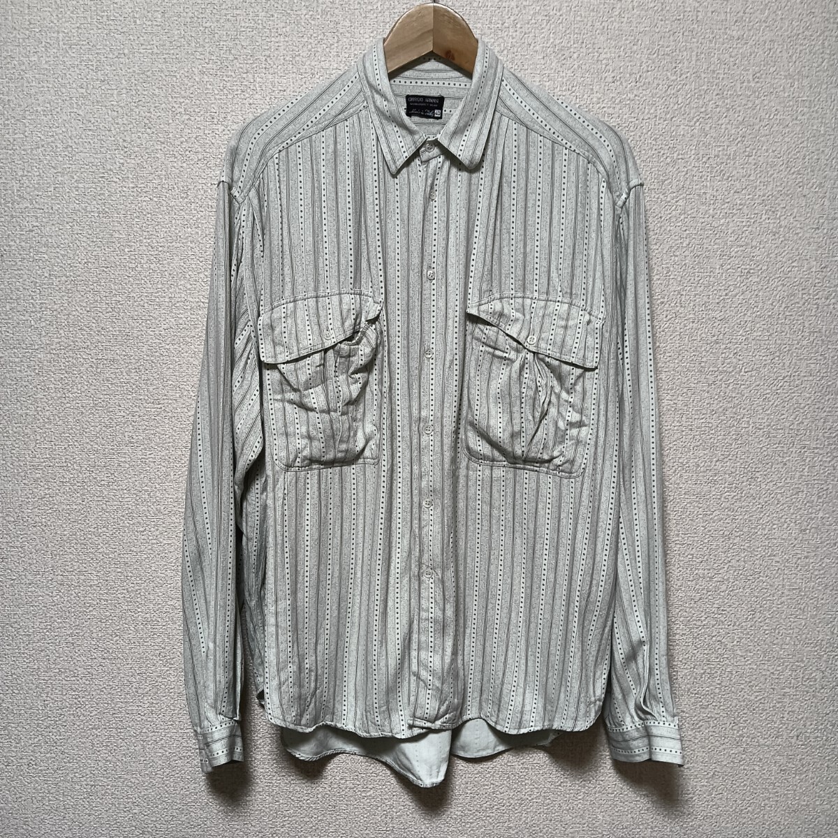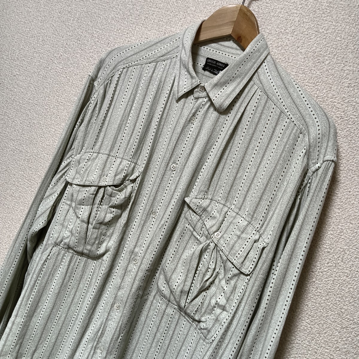 ★80-90's VINTAGE OLD GIORGIO ARMANI ジョルジオアルマーニ レーヨン ドレープ 長袖 シャツ ライムグリーン 総柄 ストライプ ドット ビスコース 人工シルク メンズ サイズ40 アーカイブ ヴィンテージ オールド 黒タグ イタリア製 古着 USED