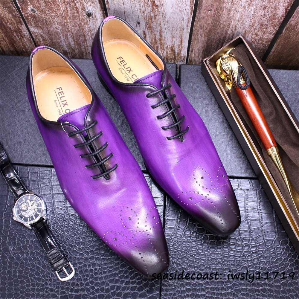 定価11万★超希少 ビジネスシューズ メンズ 職人手塗仕上げ 彫り 本革レザーシューズ 最高級 紳士靴 フォーマル 革靴 牛革 パープル 27.0cm