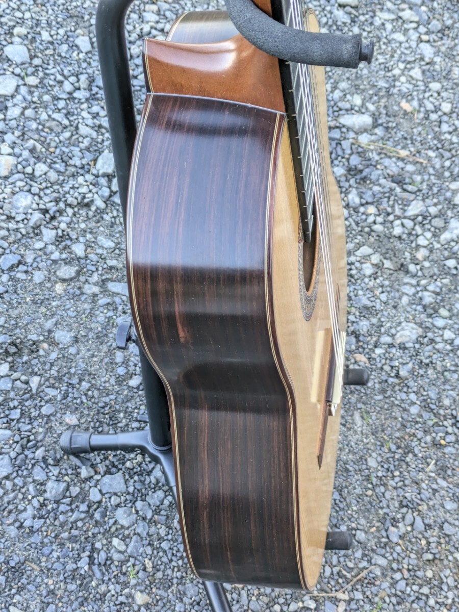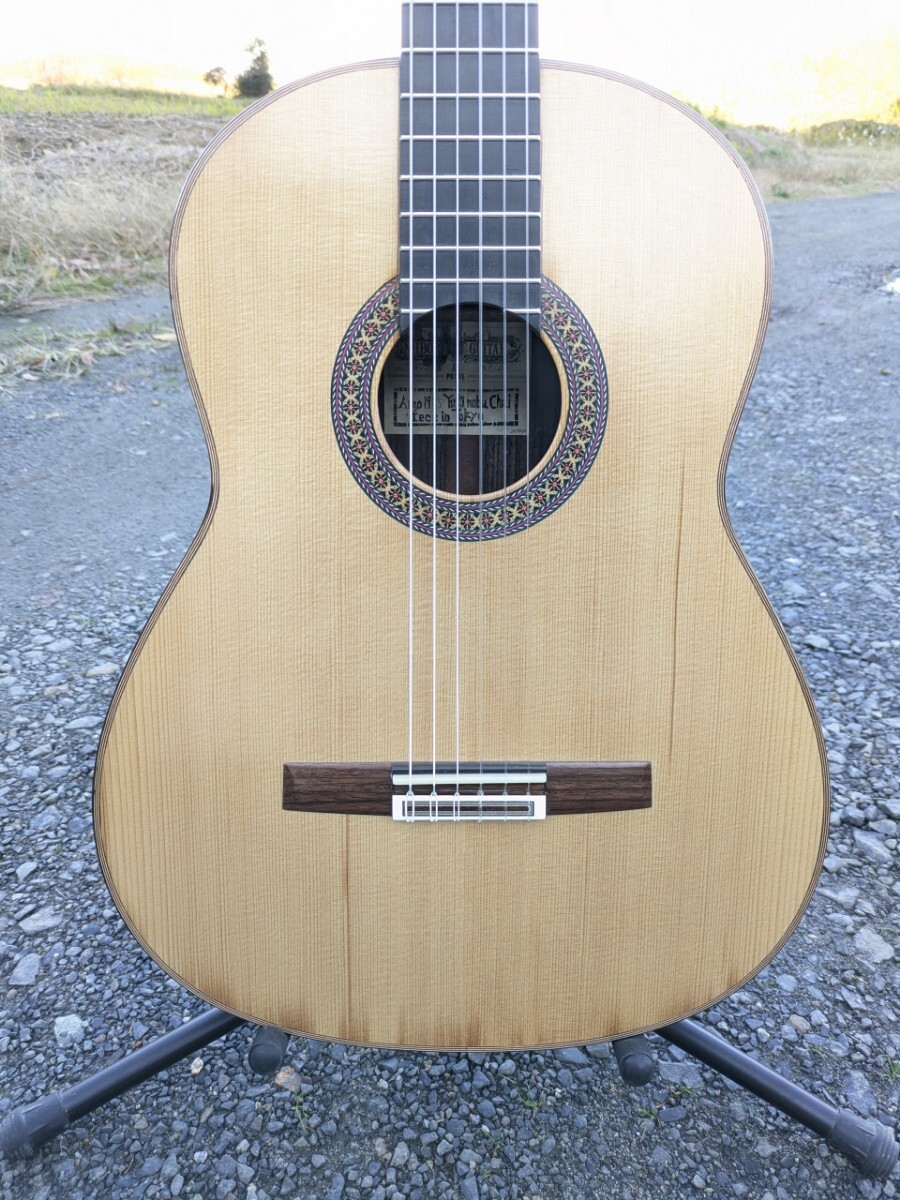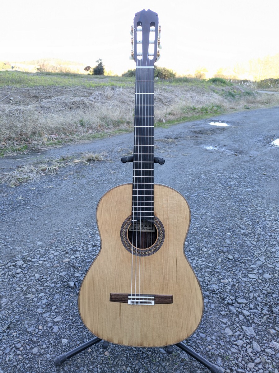 茶位ギターはトップの板厚が比較的厚く、少し重めに作られている為に周りに音が広がると言うよりも、前にストレートに飛んでいく印象です。ハウザーの様に倍音少な目で、深いと言うよりも引き締まった音がしています。クリヤトーンで良くも悪くも雑味が無く、バッハの様な対位法の曲を弾くのに適していると思います。