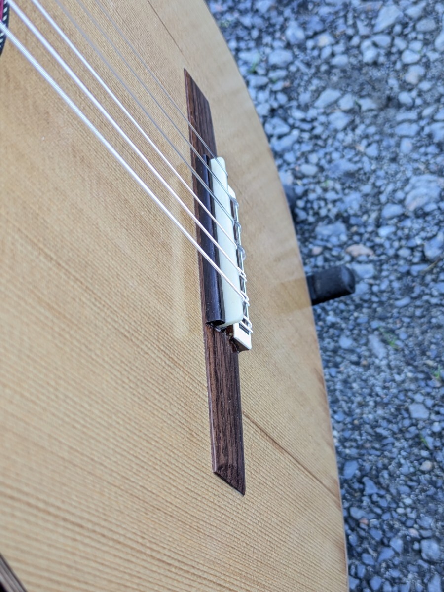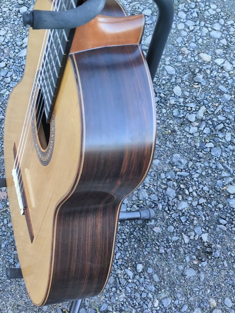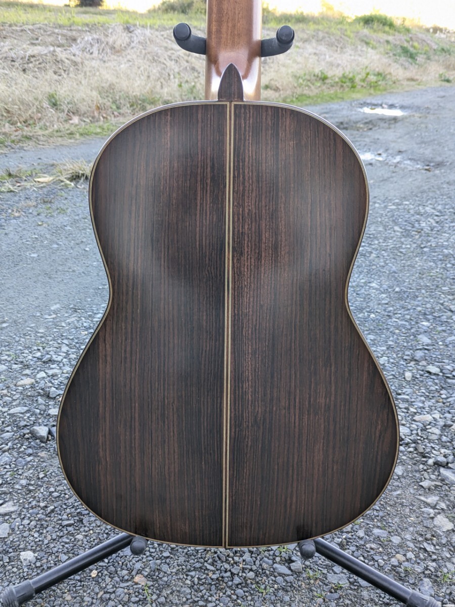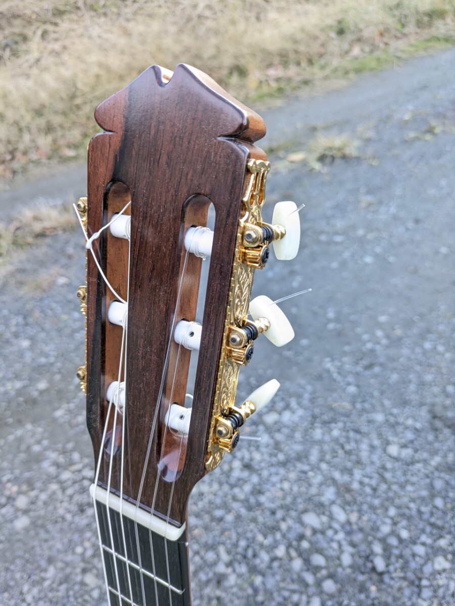 茶位ギターはトップの板厚が比較的厚く、少し重めに作られている為に周りに音が広がると言うよりも、前にストレートに飛んでいく印象です。ハウザーの様に倍音少な目で、深いと言うよりも引き締まった音がしています。クリヤトーンで良くも悪くも雑味が無く、バッハの様な対位法の曲を弾くのに適していると思います。