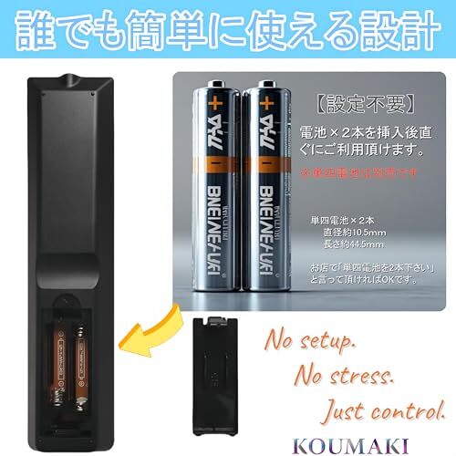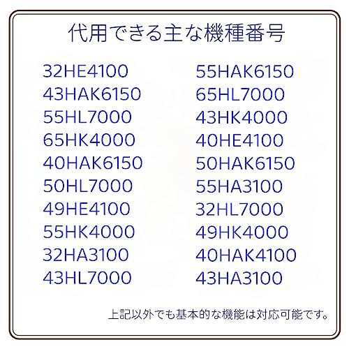 5.単4電池を2本使用します(別売品)。テレビのモデルによっては一部の機能が使用できない場合があります。以下は対応確認済み品番 32HE4100 43HAK6150 55HL7000 65HK4000 40HAK6150 50HL7000 49HE4100 55HK4000 32HA3100 43HL7000 55HAK6150 65HL7000 43HK4000 40HE4100 50HAK6150 55HA3100 32HL7000 49HK4000 40HAK4100 43HA3100