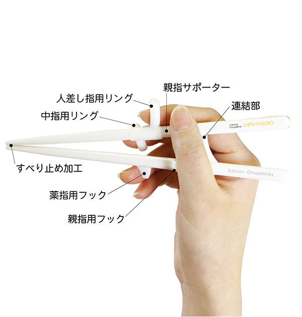 | 商品説明 | お箸のきれいな持ち方、正しい使い方を練習出来るエジソンのお箸。リングに指を入れることで正しく持てる設計になっており、リングは正しい指の角度をサポート。連結されているのでお箸が苦手な方でも練習しやすく、3つのステップで一般のお箸に移行できる仕組みになっています。 |