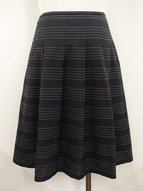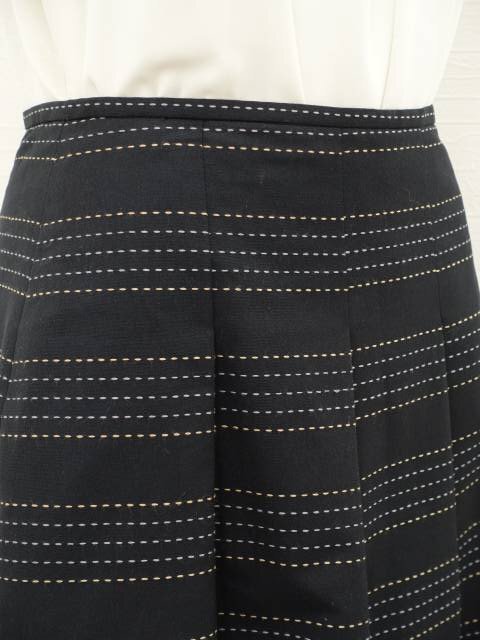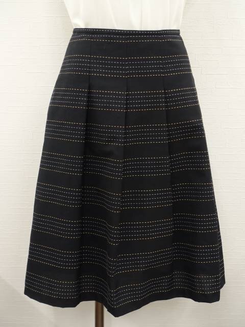 ひざ丈 タックスカート ブラック地 ブルー×オレンジ ボーダー柄