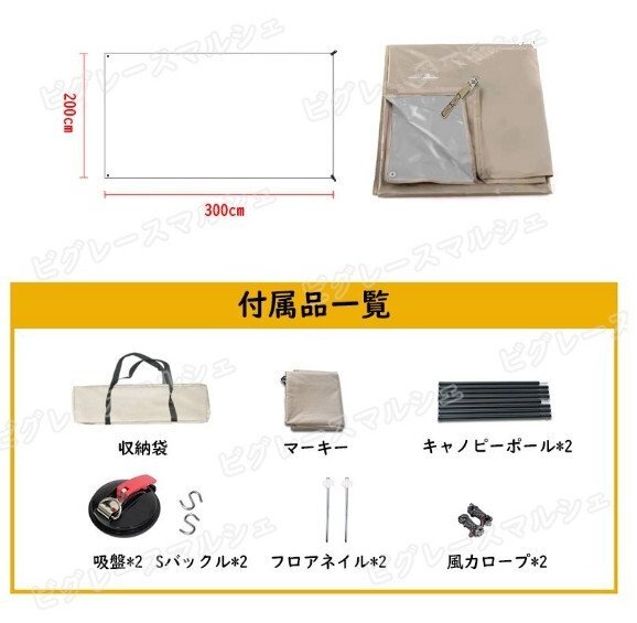 【付属品】:収納袋+日よけ布+日よけポール*2+吸盤*2+Sバックル*2+地釘*2+風ロープ*2