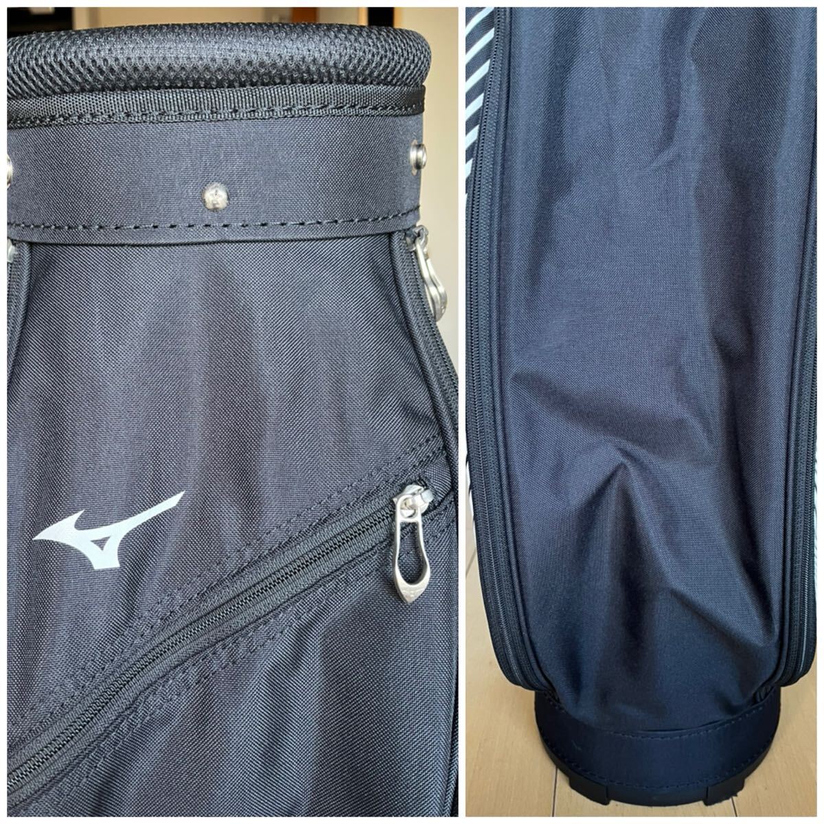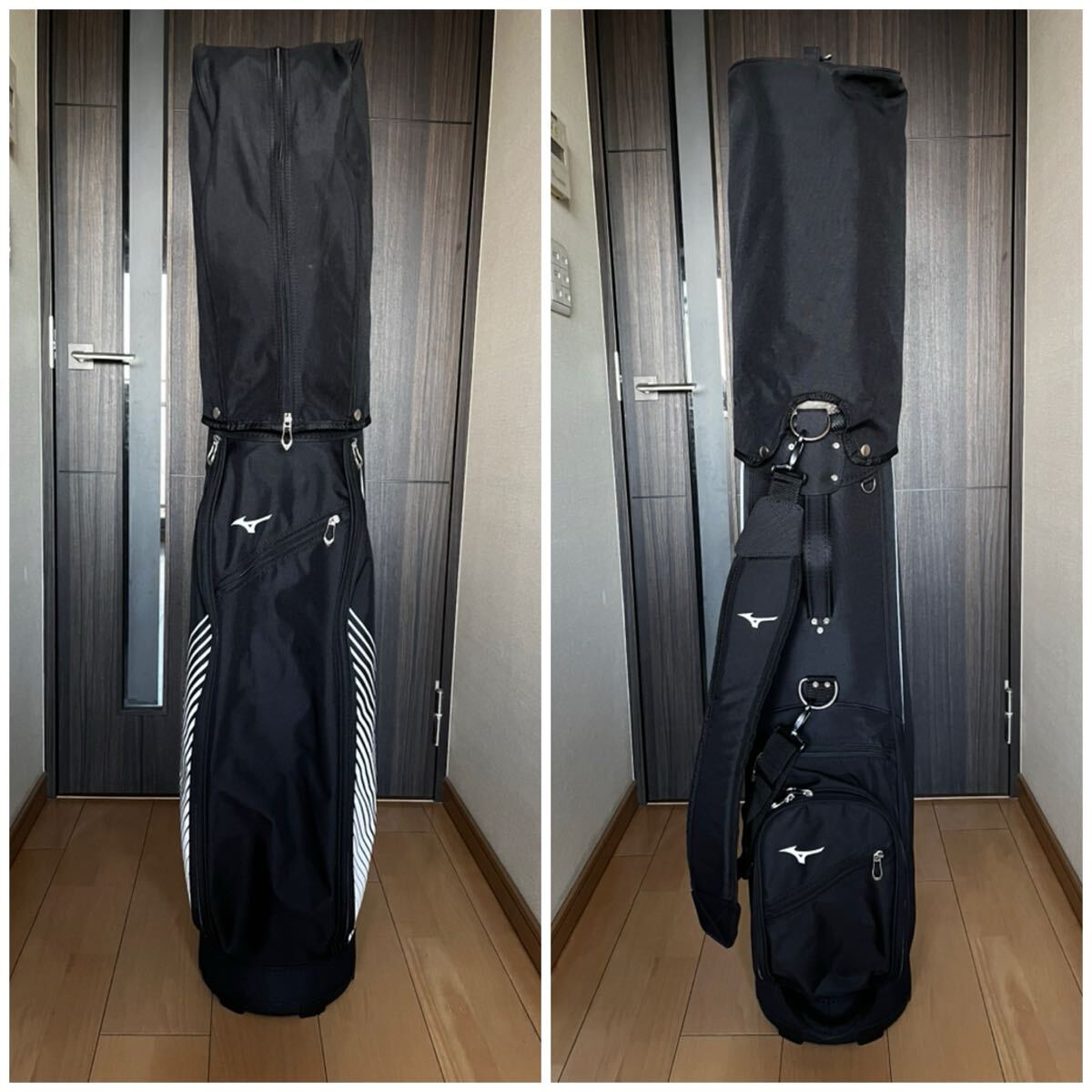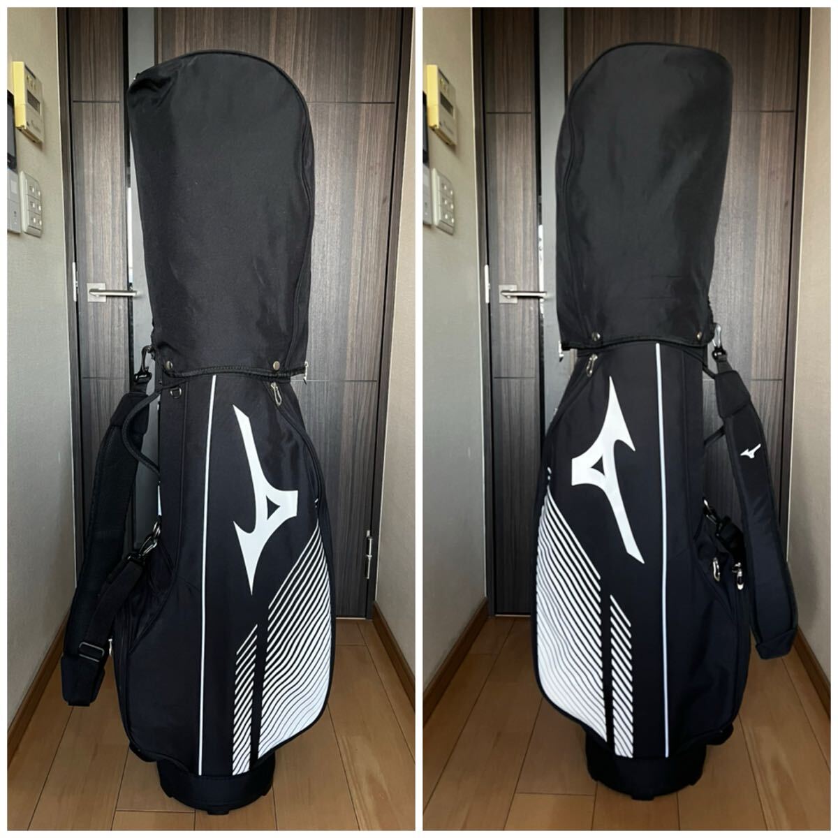 Mizunoのブラックに白が高級感漂う落ち着いた大人のとってもカッコ良いカート型キャディバックになります。