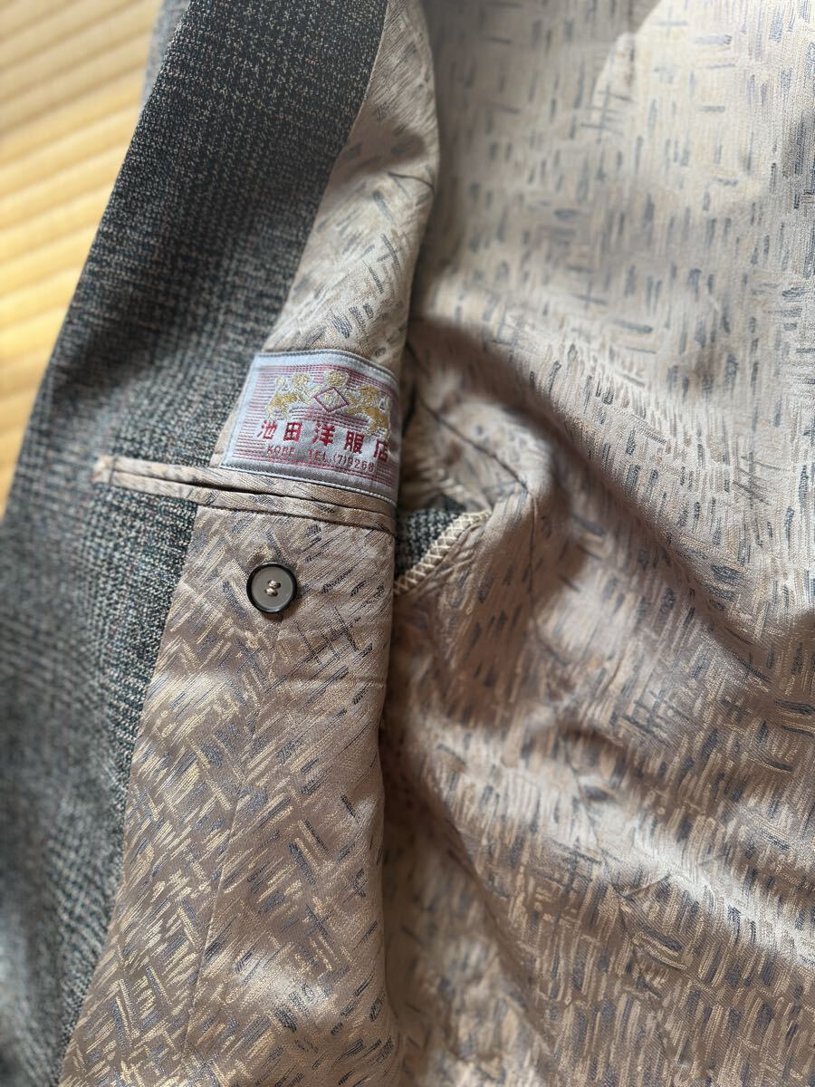 裏地には抽象的な柄の入ったサテン生地が使われ、内ポケットにはボタン留めのフラップが付きます。胸元には「Ikeda Tailor Shop, Kobe」のオリジナルネームが残っており、戦後〜高度成長期の日本のテーラー仕立ての仕事がそのまま残っているジャケットです。
