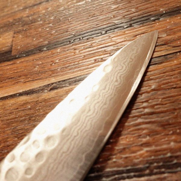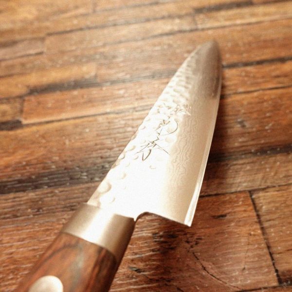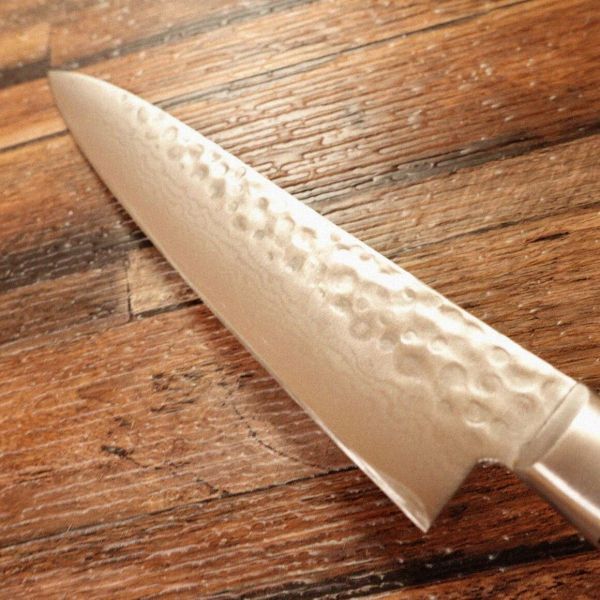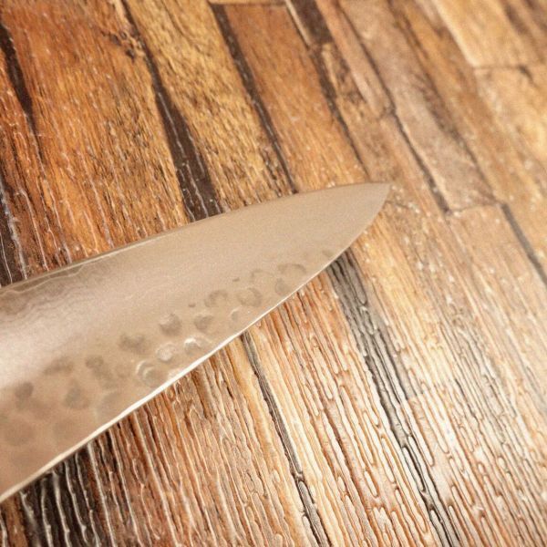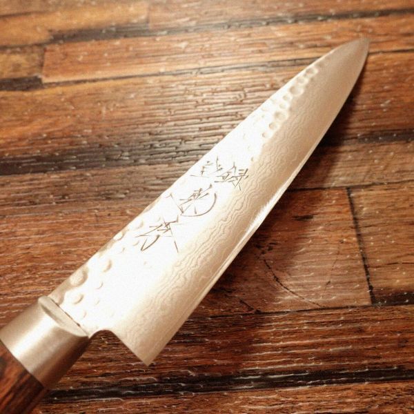 ほぼ未使用の保管品です。ダマスカスや槌目紋が非常に美しいペティナイフです。17層ダマスカスに槌目紋が映えるデザインで、見た目の良さと食材離れの良さを両立しています。マホガニー柄も落ち着いた雰囲気で手になじみやすいでしょう。