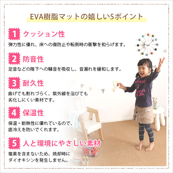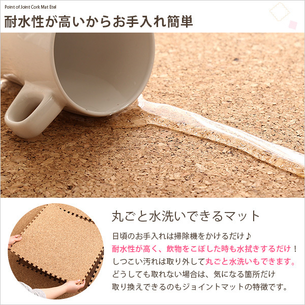 【ポイント】 大粒の天然コルクを使用したジョイントコルクマット32枚タイプです。 衝撃を吸収するEVA樹脂だから防音効果や保温効果があります。 安心して使える低ホルムアルデヒド商品、水洗いできるから、汚れても安心♪ レイアウトしやすいサイドパーツ付きです。 |