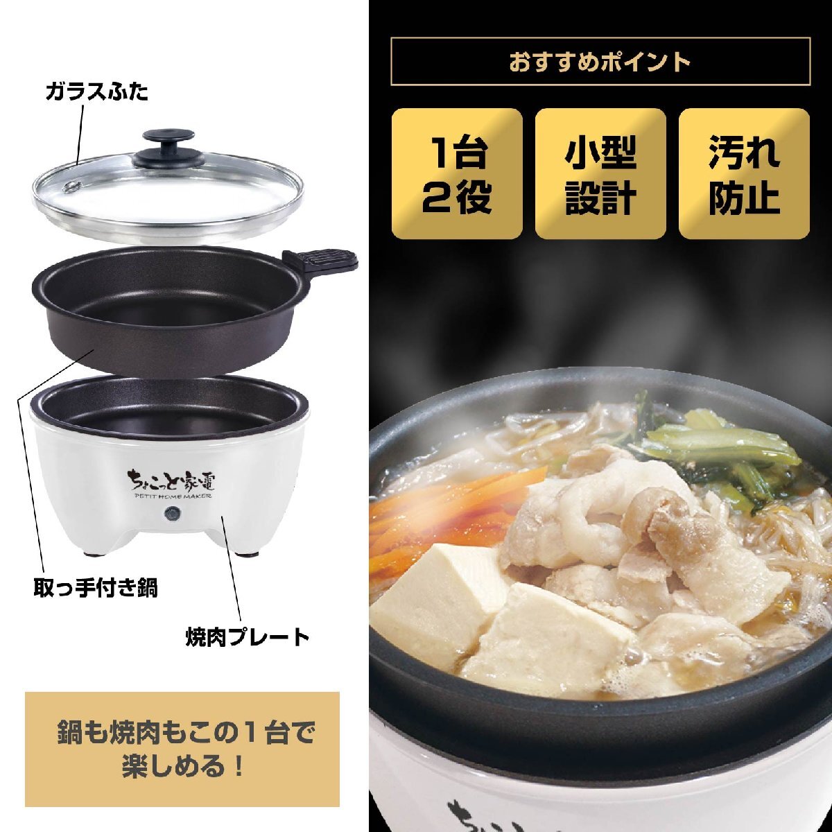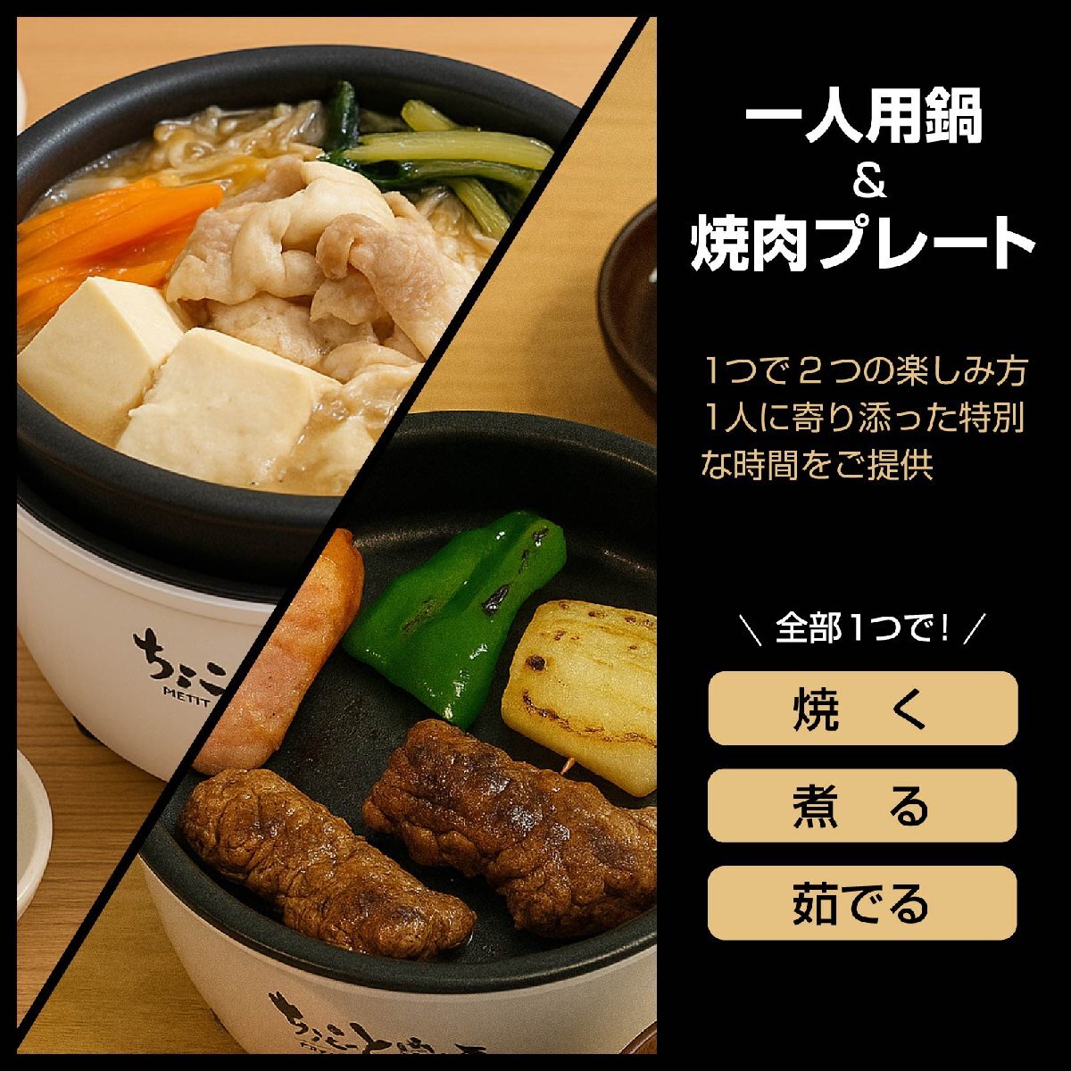 1台2役:鍋と焼肉プレートがセットになっており、煮物や焼き料理を手軽に楽しめます