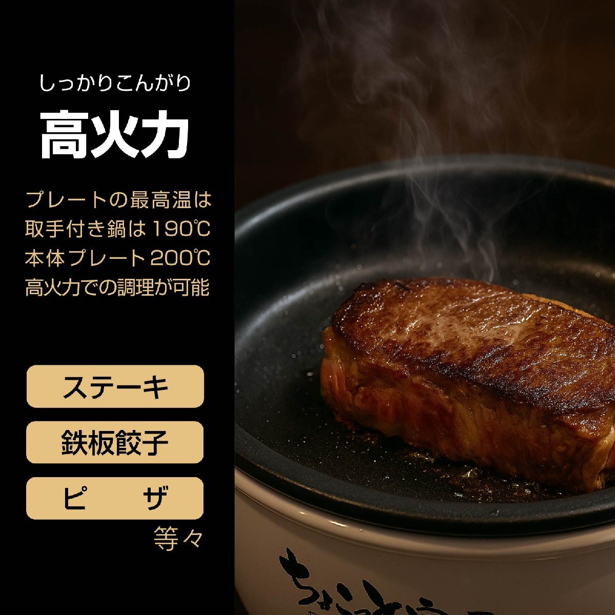 しっかり高火力:プレート最高温度約200℃でこんがり焼き上げ可能