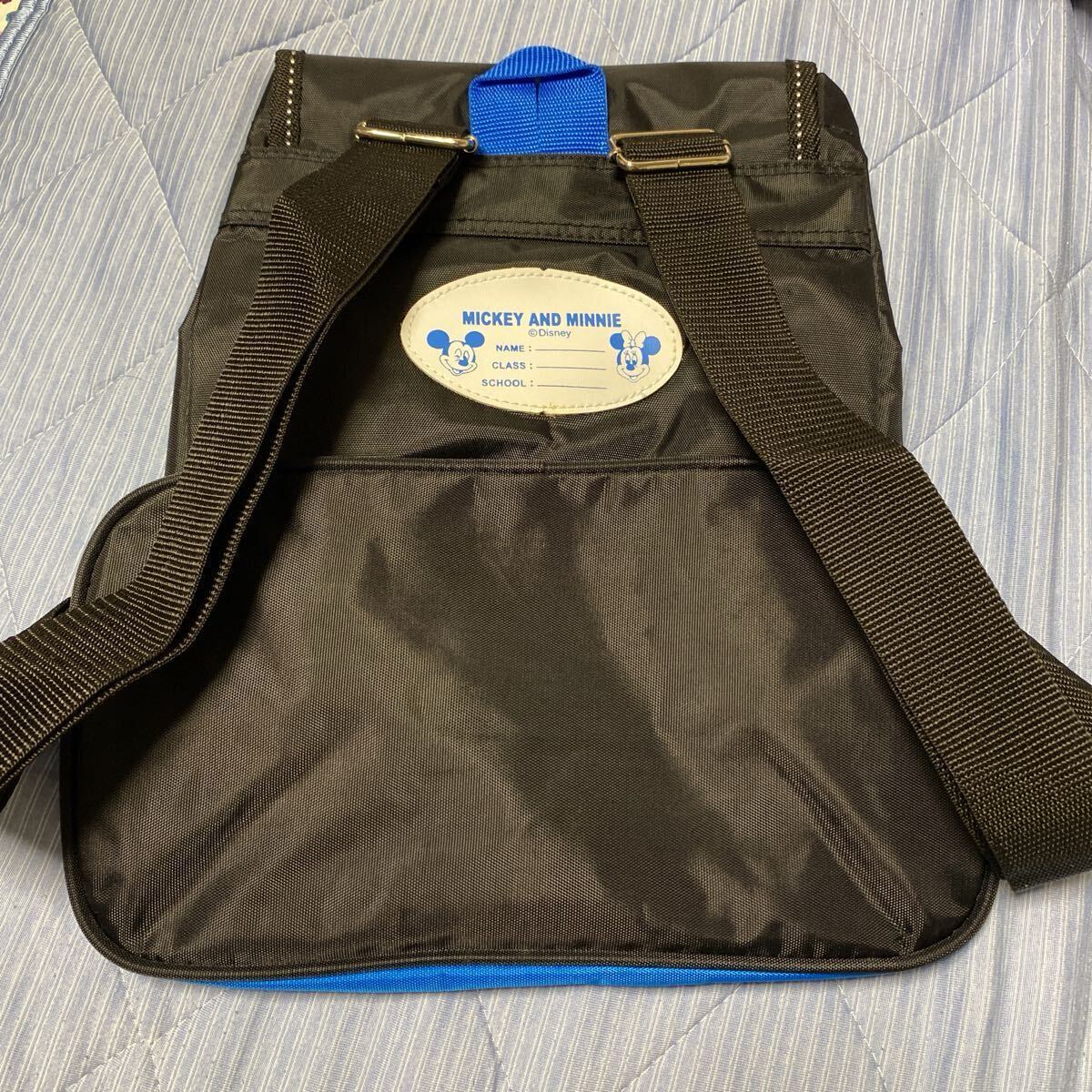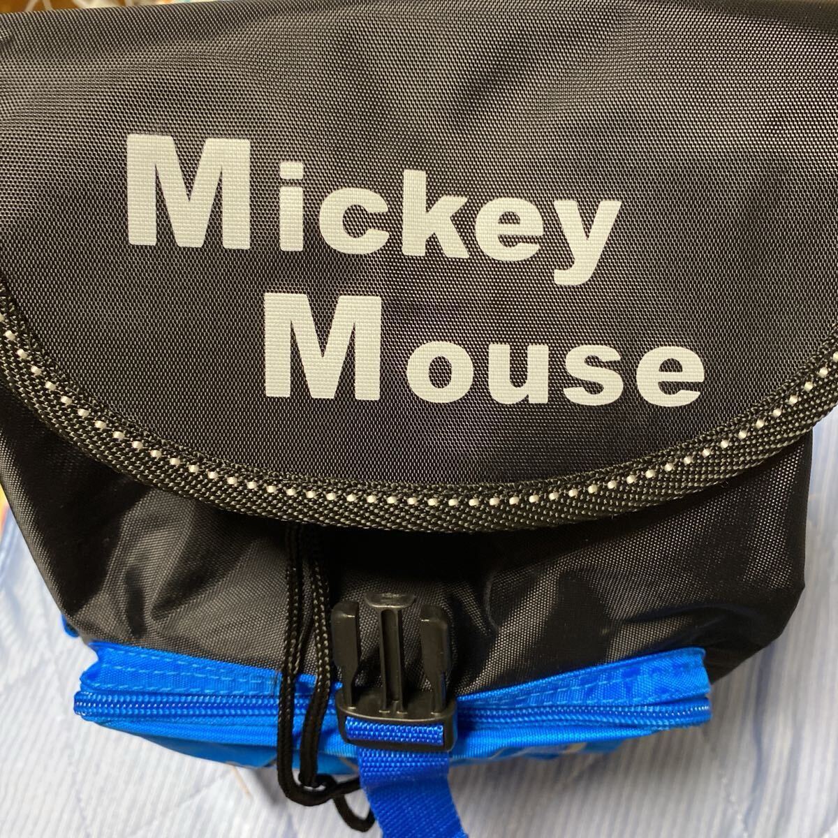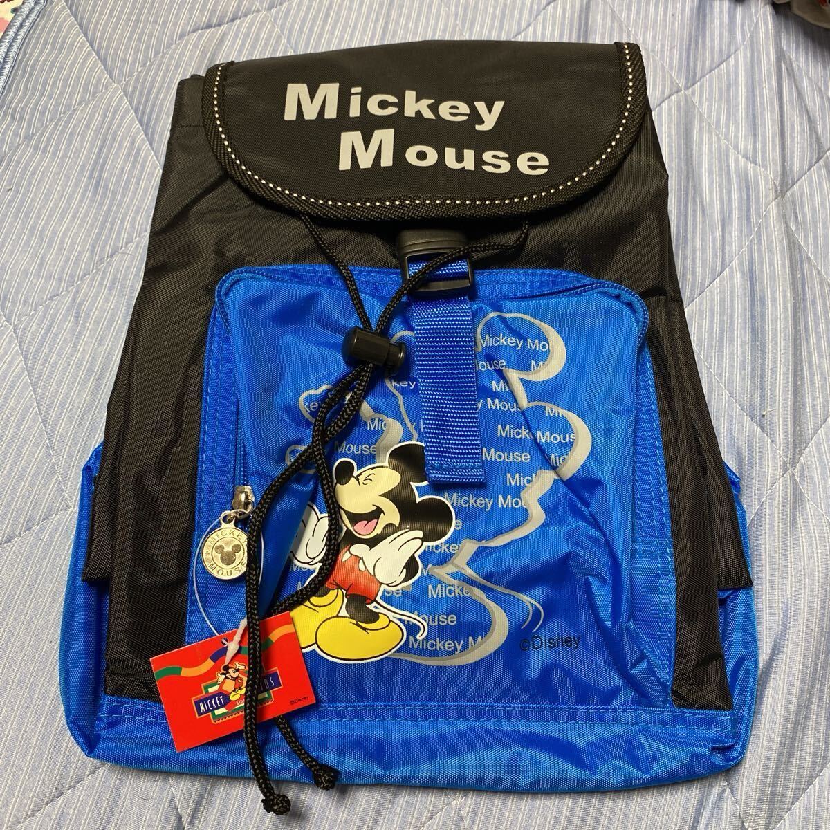 ミッキーマウスのリュックサックです。前にファスナーポケット一つ、サイドポケット二つ、うちポケット一つ。送料無料。名前タグあります。高さ33cm, 底幅28cm, 幅12.5cm。