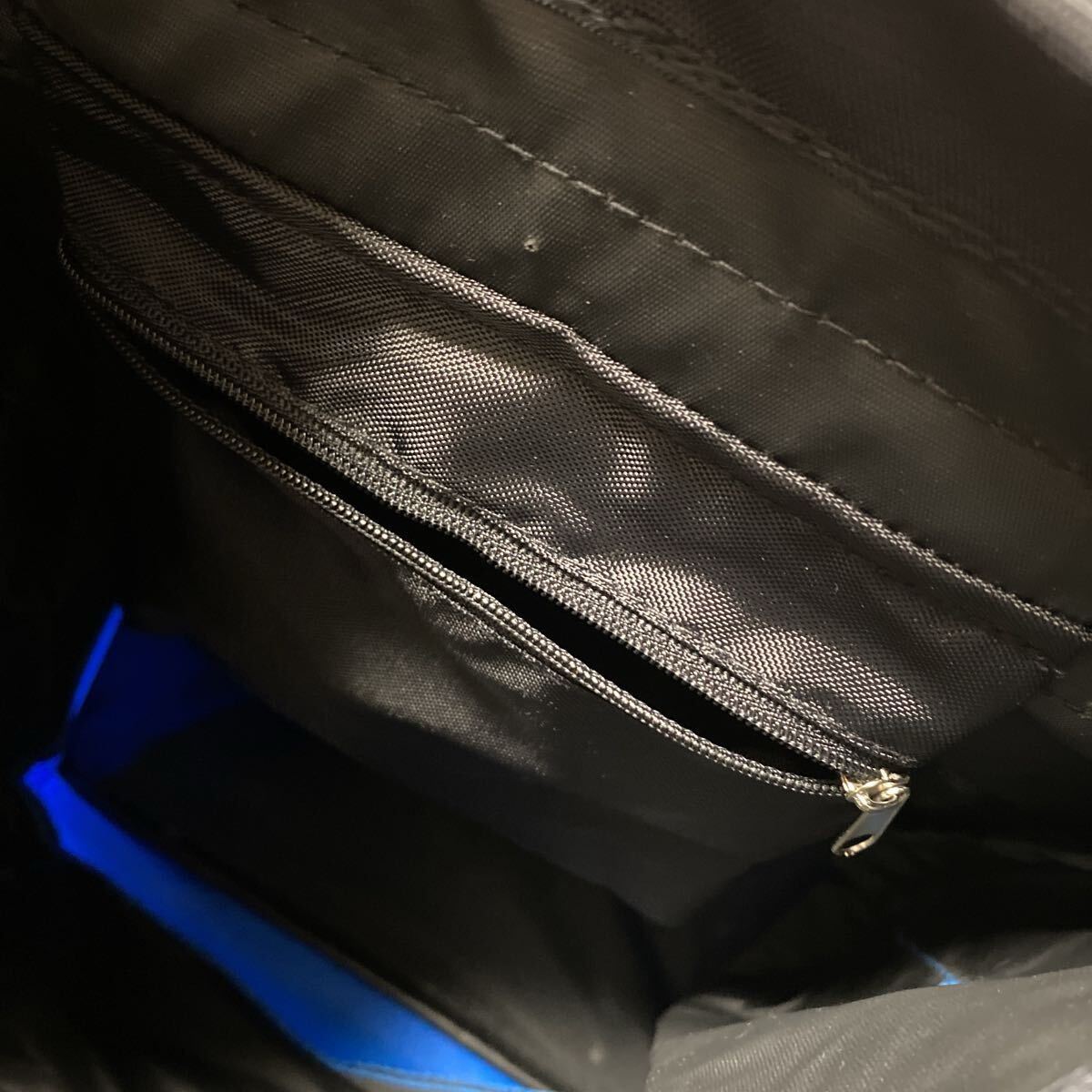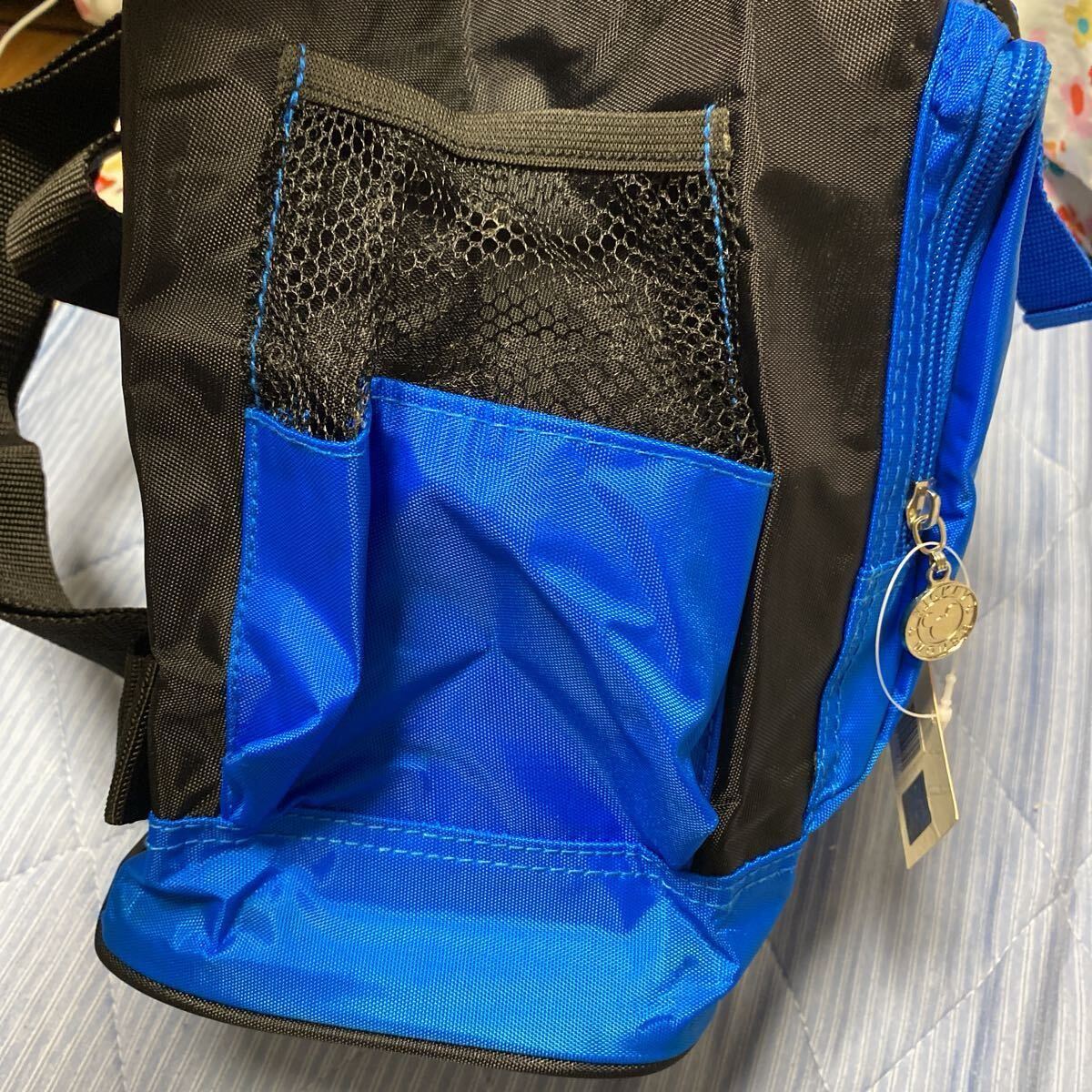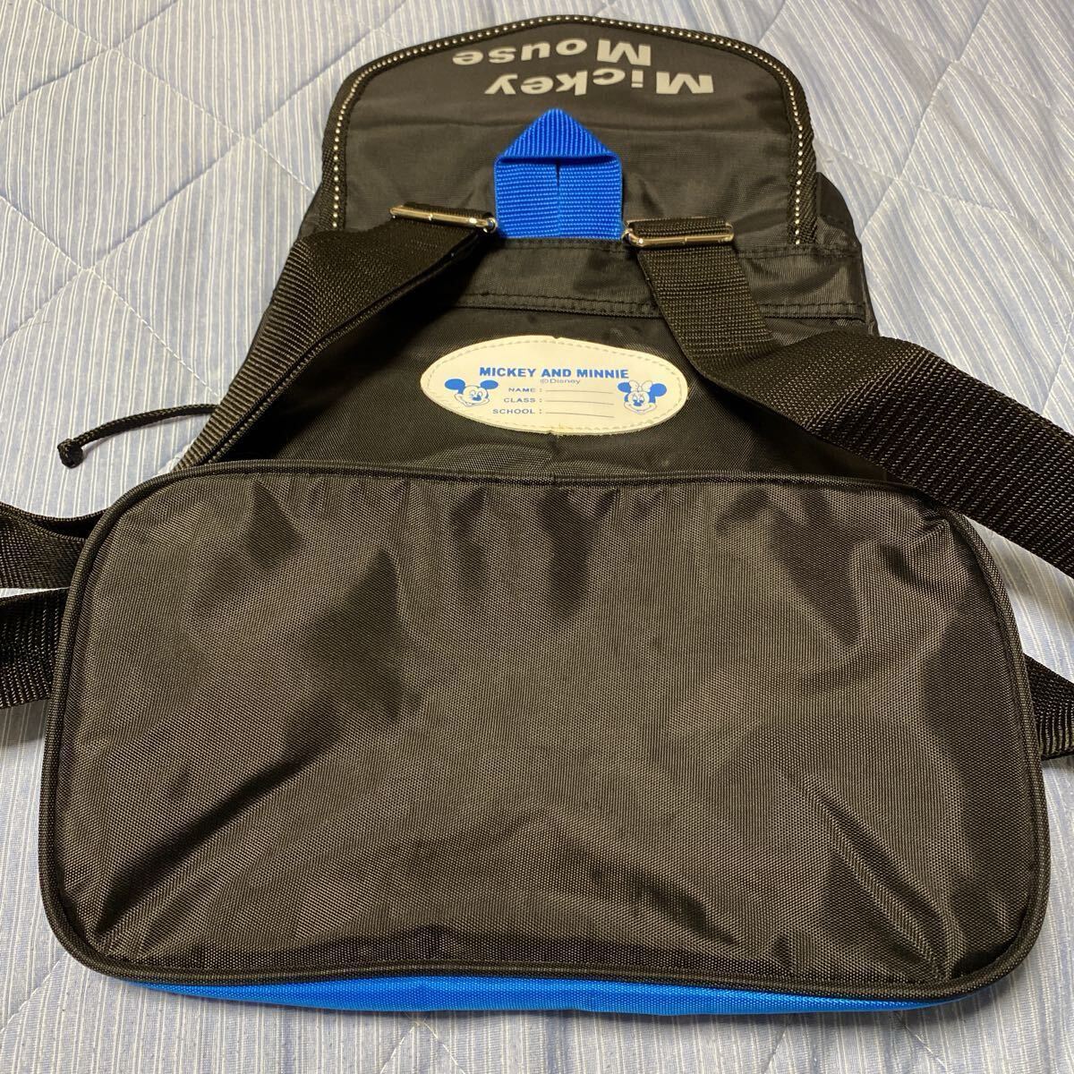 ミッキーマウスのリュックサックです。前にファスナーポケット一つ、サイドポケット二つ、うちポケット一つ。送料無料。名前タグあります。高さ33cm, 底幅28cm, 幅12.5cm。
