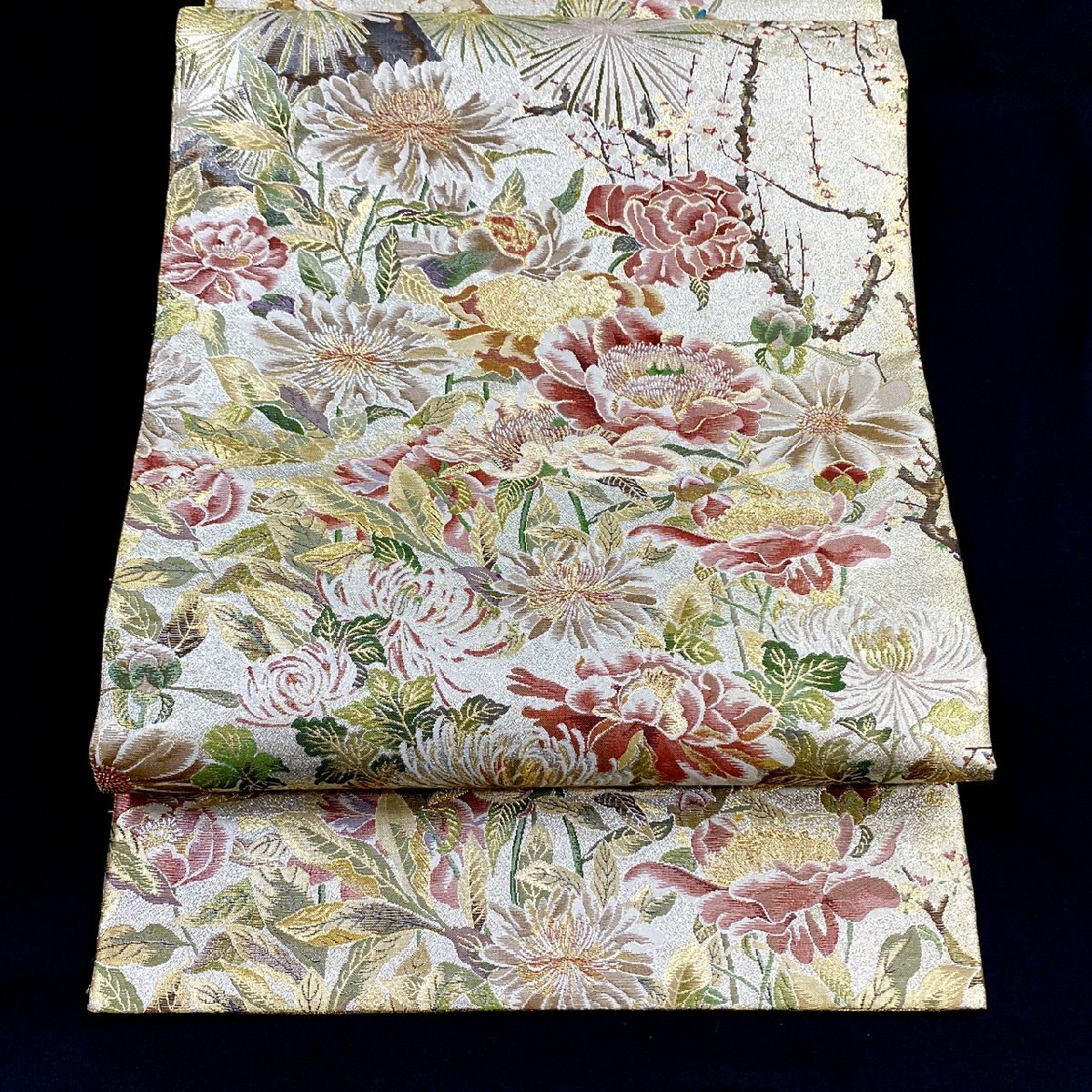 着物月花 あさぎ 伊藤若冲 プラチナ本金箔壱阡八百口織 細密花鳥図 丸帯 未使用品 全通柄 正絹 金銀糸 西陣織物 ガード加工 ob7571