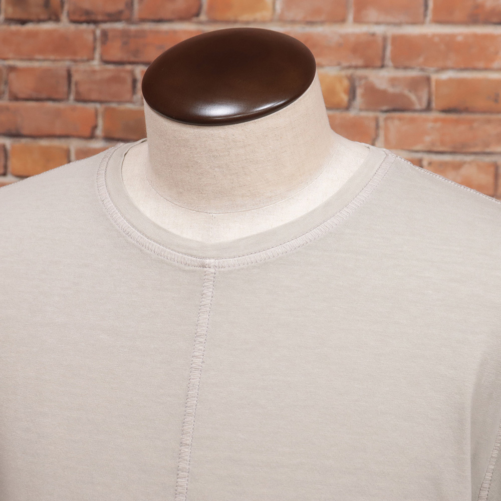 なめらかな肌触りのコットンジャージーを使用した半袖Tシャツ。上質な素材による柔らかな風合いと、杢調のスモーキーなベージュカラーが落ち着いた大人の雰囲気を演出します。シンプルながらもセンターシームを配したデザインがさりげないアクセントとなり、洗練された印象に仕上がっています。