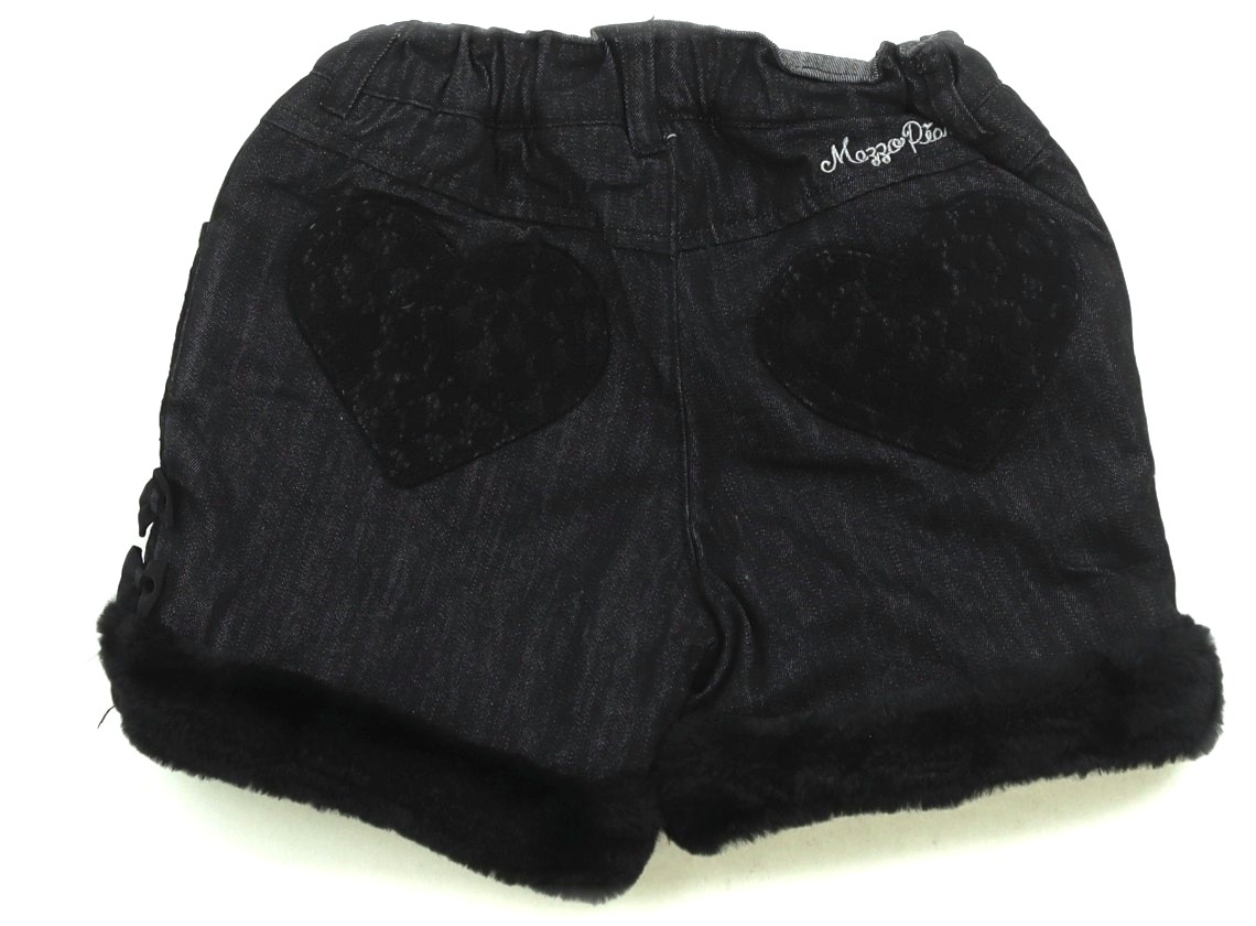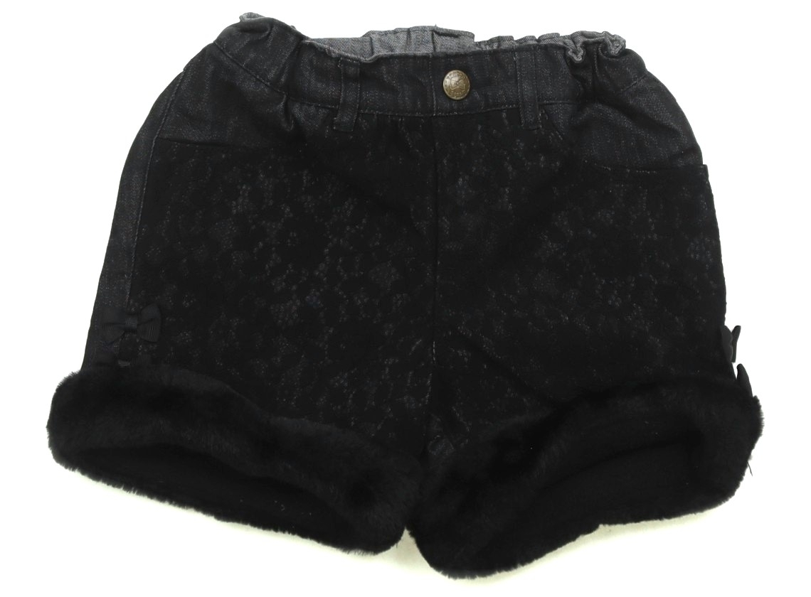ナイロン混ポリエステル素材、デニム調生地に前身頃のみレースが重なっているデザインです。サイズ調整ゴムが付いています。内側はフリース生地、裾はボア生地です。 色落ち感がありますが、まだまだお使いいただけそうです。