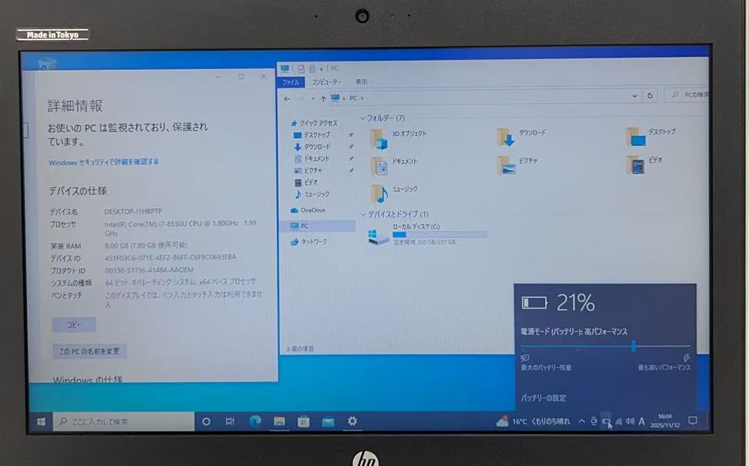 中古ノートパソコン★Windows10★hp Core i7-8550U/@1.99/8GB/SSD 256GB/13インチ以上★