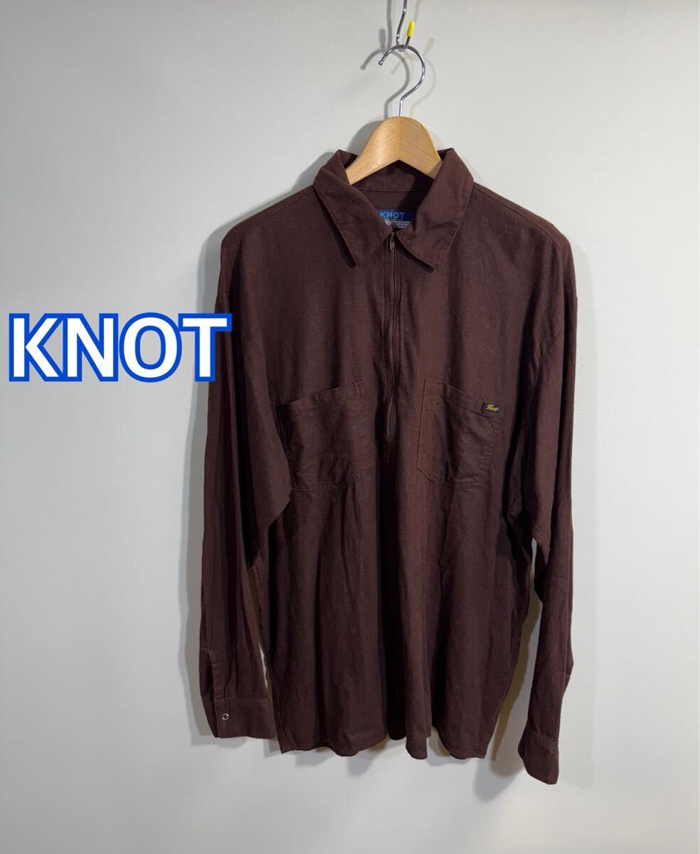 ブラウンの長袖シャツ、KNOTブランド、1990年設立のデザイン。