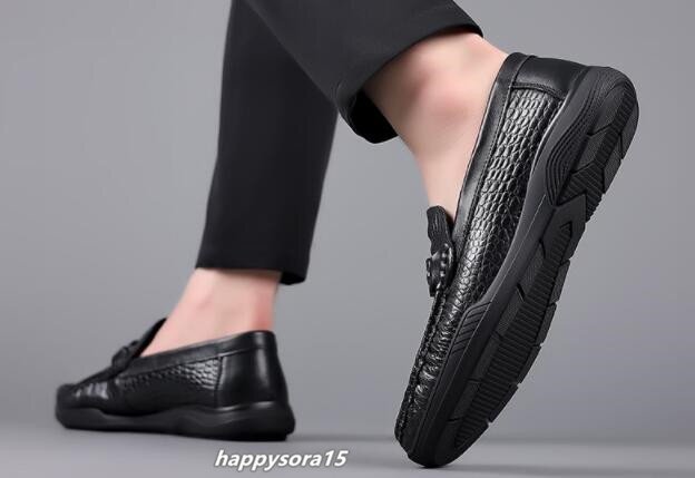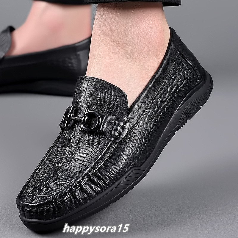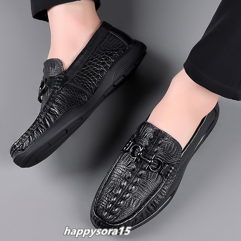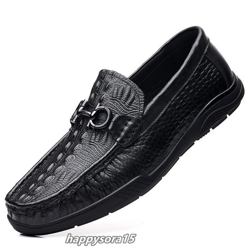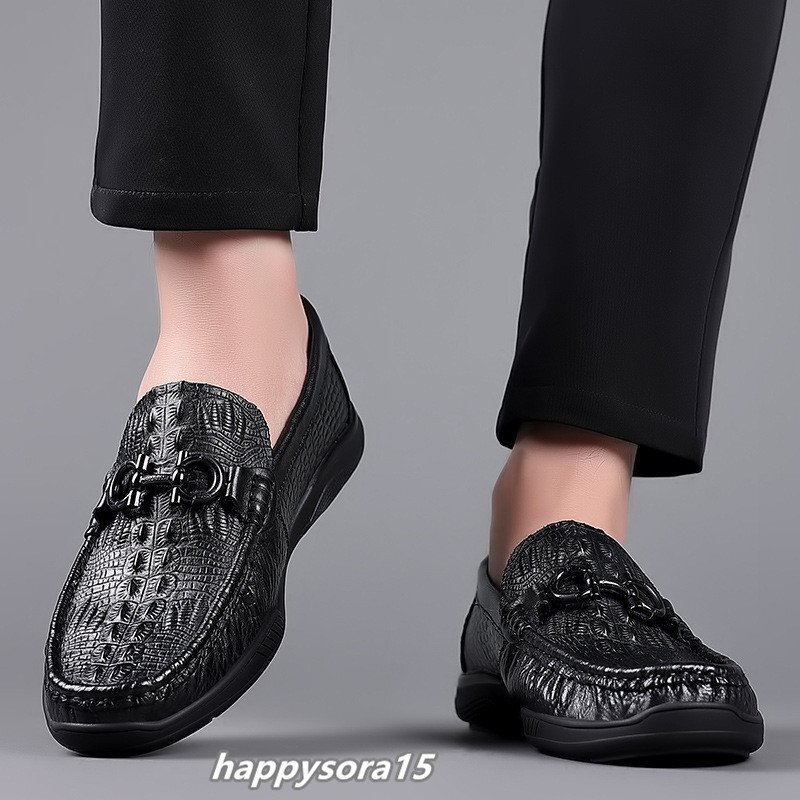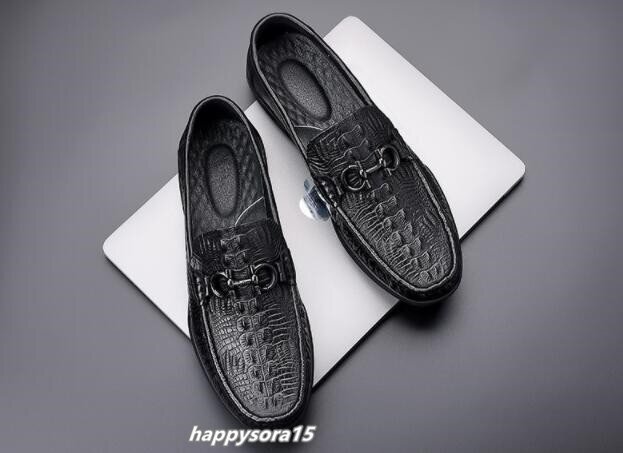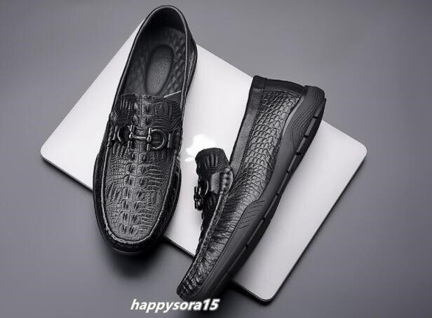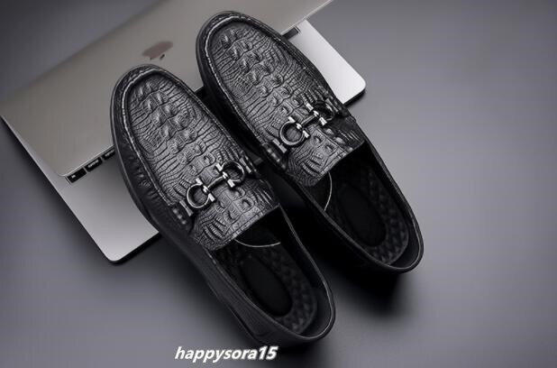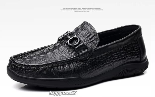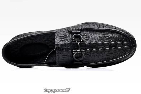 ローファー メンズ スリッポン ビジネスシューズ 本革 牛革 ローカット カジュアル メタル ワニ柄 クロコダイル ブラック 25.5cm