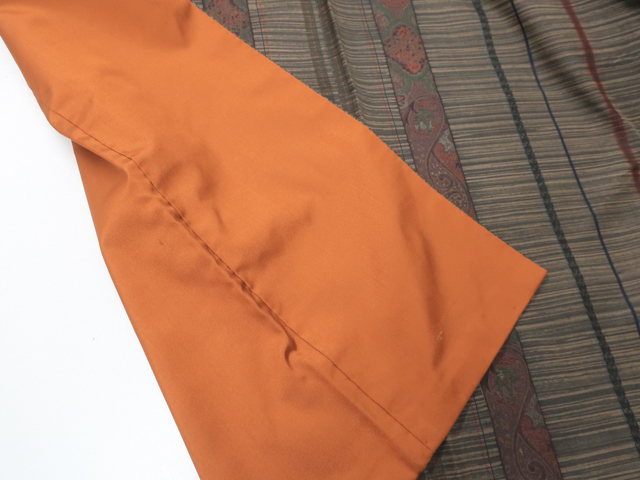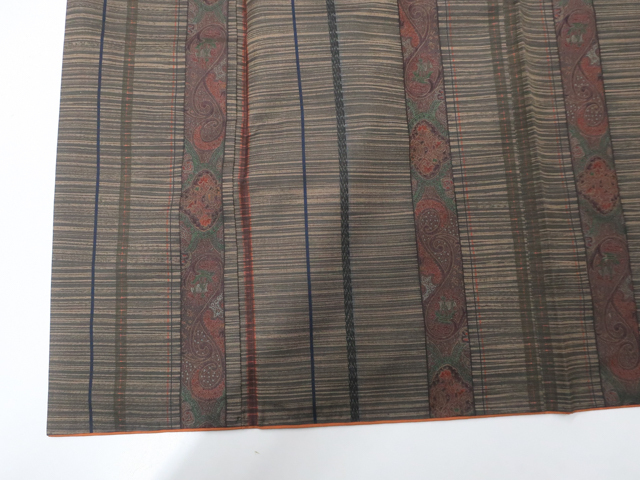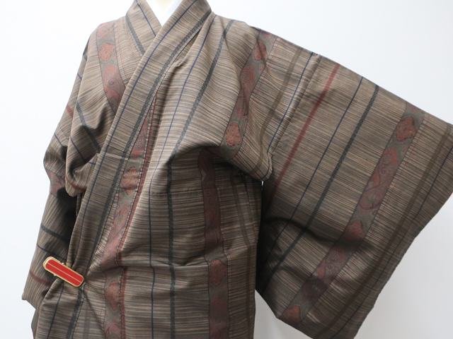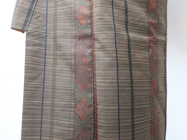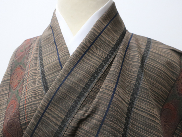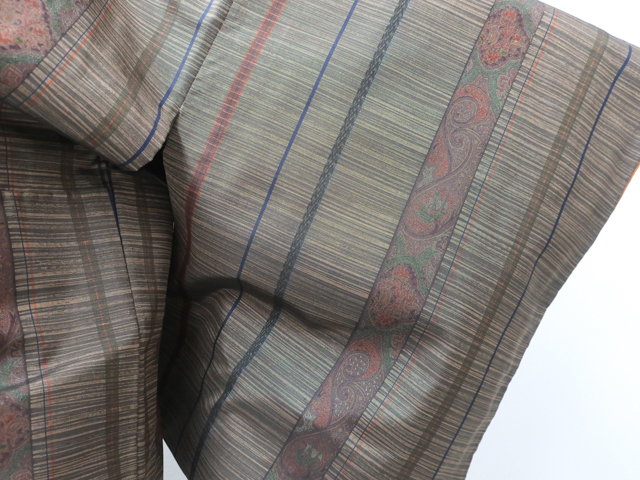 リサイクル商品のため、胴裏スナップボタン汚れとしみがございますが着用可能なお品です。 地色は こげ茶です。 1枚目の画像が近いお色かと思われます。 素材は正絹です。 |