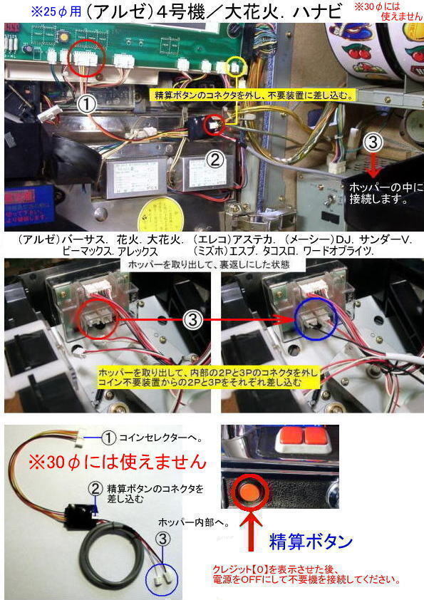 | 対応機種 コイン不要機リスト 〔①-4〕 | (アルゼ) 花火(初代HANABI.ハナビ).大花火25¢. ※30Φには使えません。 タロットマスターR.アレックス.デュエルドラゴン2.バイオメサイア.ビーマックス クランキーコンテスト.グランシェル.バーサス (エレコ) アステカ.ゲッターマウス.ボーナスショップ.DJ.G7X (メーシー) DJ.サンダーV ※サンダーV2には使えません。 (ミズホ) エスプ.タコスロ.ワードオブライツ ※オオタコスロ2には使えません。 |