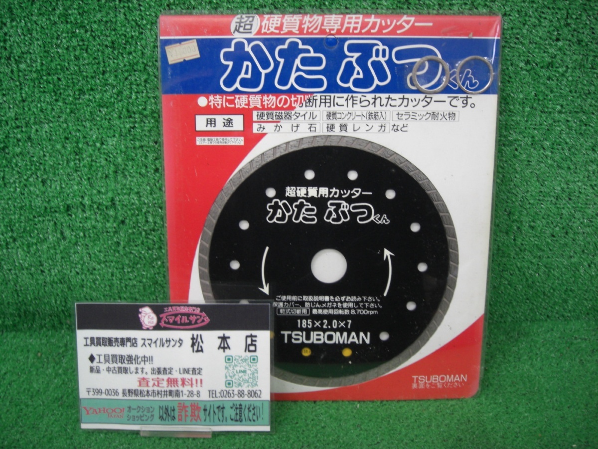 | 商品説明 | ◇メーカー ツボ万 ◇商 品 名 超硬質物専用カッター かたぶつくん ◇状 態 長期保管品につきテープの劣化による汚れ剥がれ跡などあります。 気になる方、新品同等品をご希望の方はご遠慮ください。 ◇仕 様 ・外径185mm ・刃厚2.0mm ・ダイヤ層(ダイヤモンドチップ)の高さ7mm ・最高使用回転数8700rpm ※画像にあるものが全てとなります。 ※詳細は下段メーカーホームページをご覧ください。 ※中古品は仕様通りの動作保証はございません。 ※ごくまれに入札中に店頭にて販売となり売り違いが発生してしまう場合がございます。その場合は出品者都合での出品キャンセルをさせていただくことがございます。予めご了承ください。 【詐欺サイトにご注意ください】 日頃より当店をご利用いただき、誠にありがとうございます。 この度、当社の製品が、当社とは関係のない詐欺サイト上で掲載されていることを確認いたしました。当社の正規販売はYahoo!ショッピングおよびYahoo!オークションのみであり、これら以外のサイトとは一切関係がございません。 【お客様への重要なお願いとご注意】 詐欺サイトでのご購入は、個人情報や金銭の被害に繋がる恐れがあります。 不審なサイトには絶対にアクセスせず、個人情報の入力やご注文はお控えください。 被害に遭われた際は、最寄りの警察署または消費者センターにご相談ください。 万が一被害に遭われてしまった場合、誠に申し訳ございませんが、当社では被害に関する対応はいたしかねますので予めご了承ください。 お客様にはご心配をおかけいたしますが、ご理解ご協力のほどお願い申し上げます。 【日本郵便 レターパックライト:全国一律430円】 | 出品店舗 | スマイルサンタ 松本店 |
