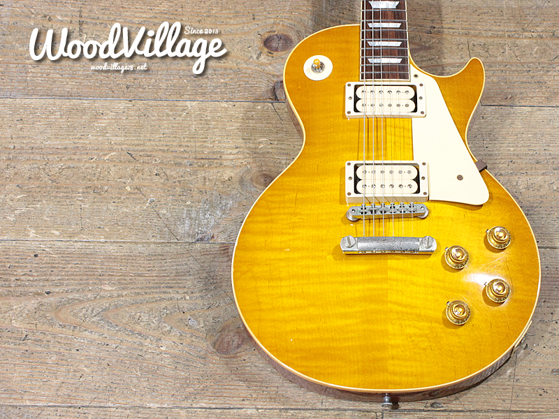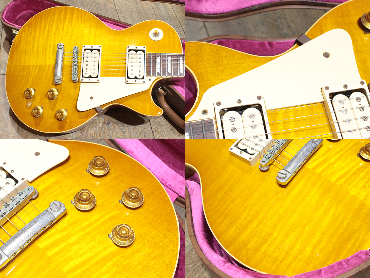 2017年製造。Historic Collectionの1958年レスポールスタンダードです。HRM(ハードロックメイプル)をトップに採用し、フィギュアドとフレックのバランスが渋い渋い。1Pマホガニーボディはレギュラーモデルではまず見られないソリッドのライトウェイト個体を採用しています。総重量は脅威の3.75kg。またネックがミソで、通常は太いグリップが特徴的な58ですが、本機は59に近い薄めの握りに仕上げられております。塗装はややGloss寄りのVOSと思われます。