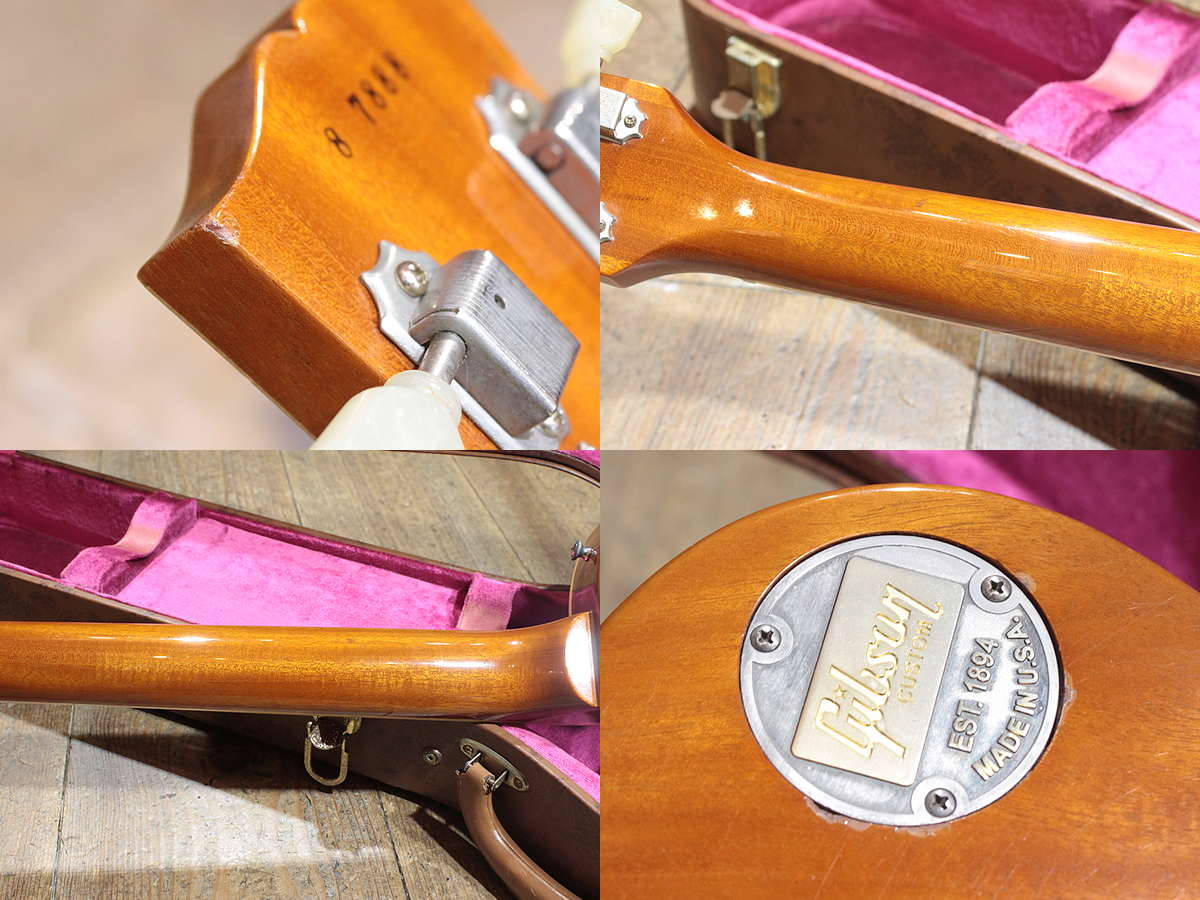 演奏性は全く問題なし。目立つキズというのはヘッド角の打痕と裏パネの縁です。使用に伴なう小キズはあります。ブリッジ、テールピースのメッキが浮いてきているのが惜しい点。ピックガードのヒンジも錆びています。ハードケースの金具も似た状態になっているので、恐らく保管状況によって変化したものと思われます。