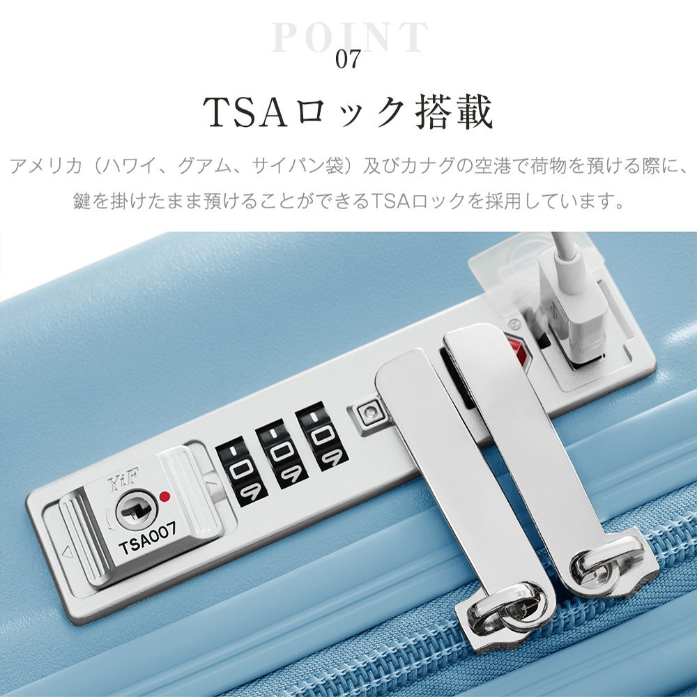 POINT 5.【海外旅行の必要品「TSAロック」搭載】アメリカ(ハワイ、グアム、サイパン含む)及びカナダの空港で荷物を預ける際に、カギをかけたまま預けることができるTSAロックを採用しています。セキュリティの不安をばっちり解消します。 ご注意: ※カギはついておりません。予めご了承ください。