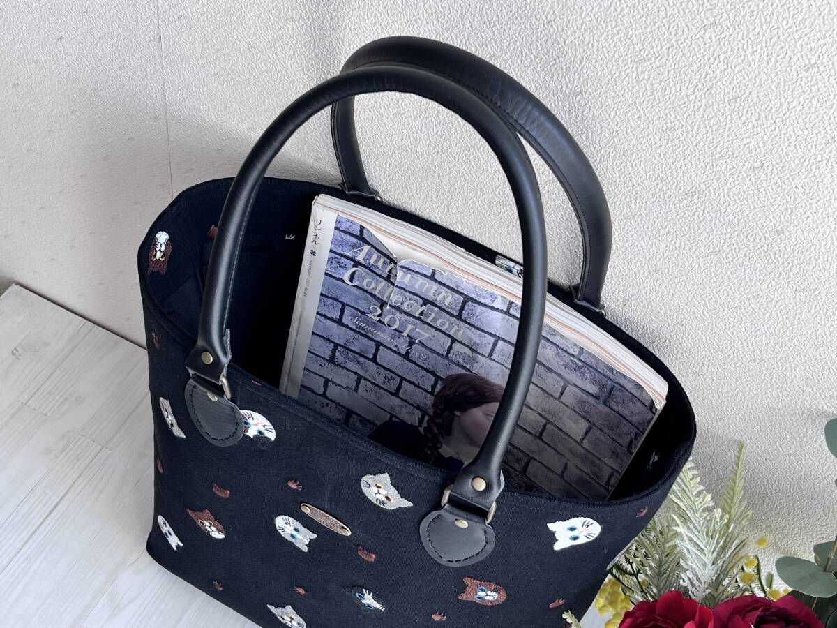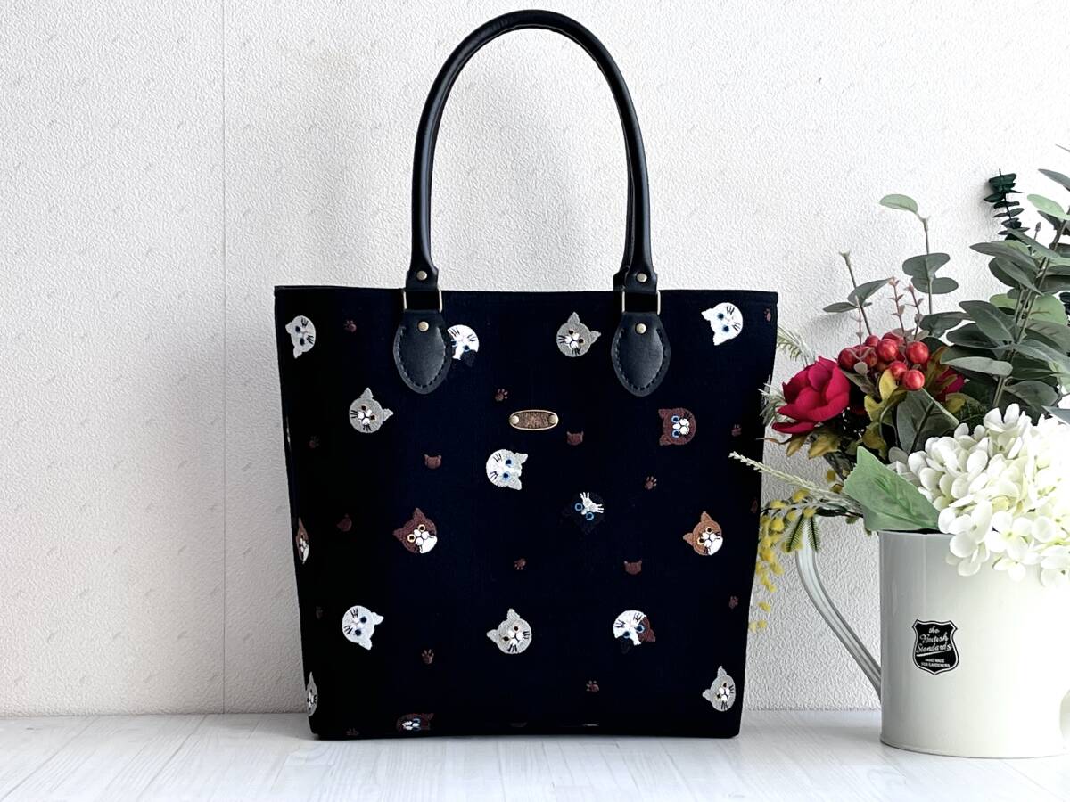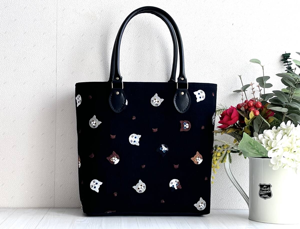 ハンドメイド+コットンリネン+手刺繍風+ネコ+ハチワレ+クロネコ+黒+大きめ+トートバッグ +ショルダーバック+樋口愉美子