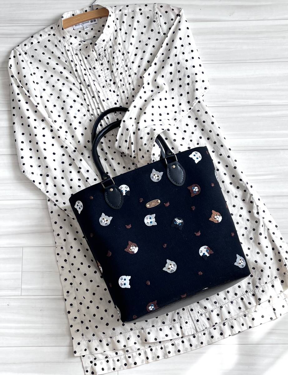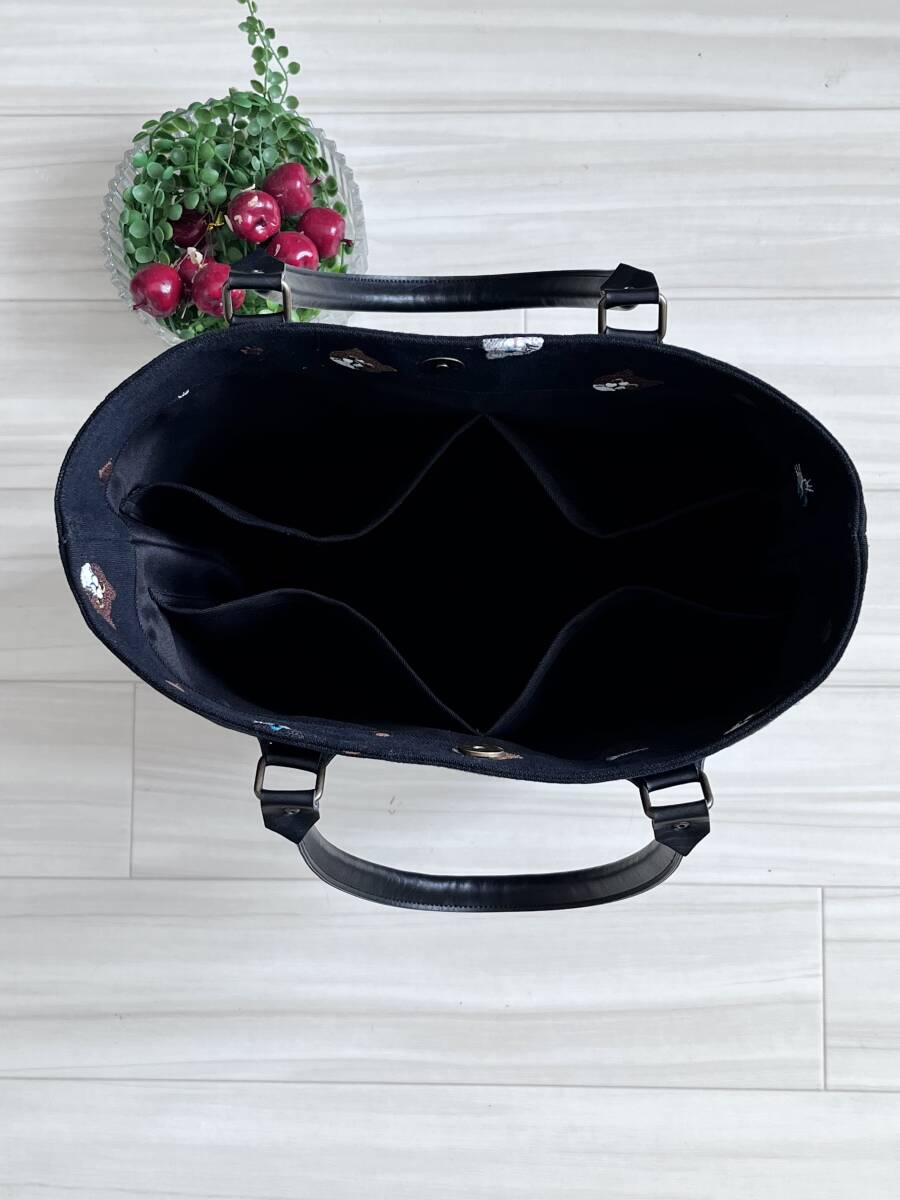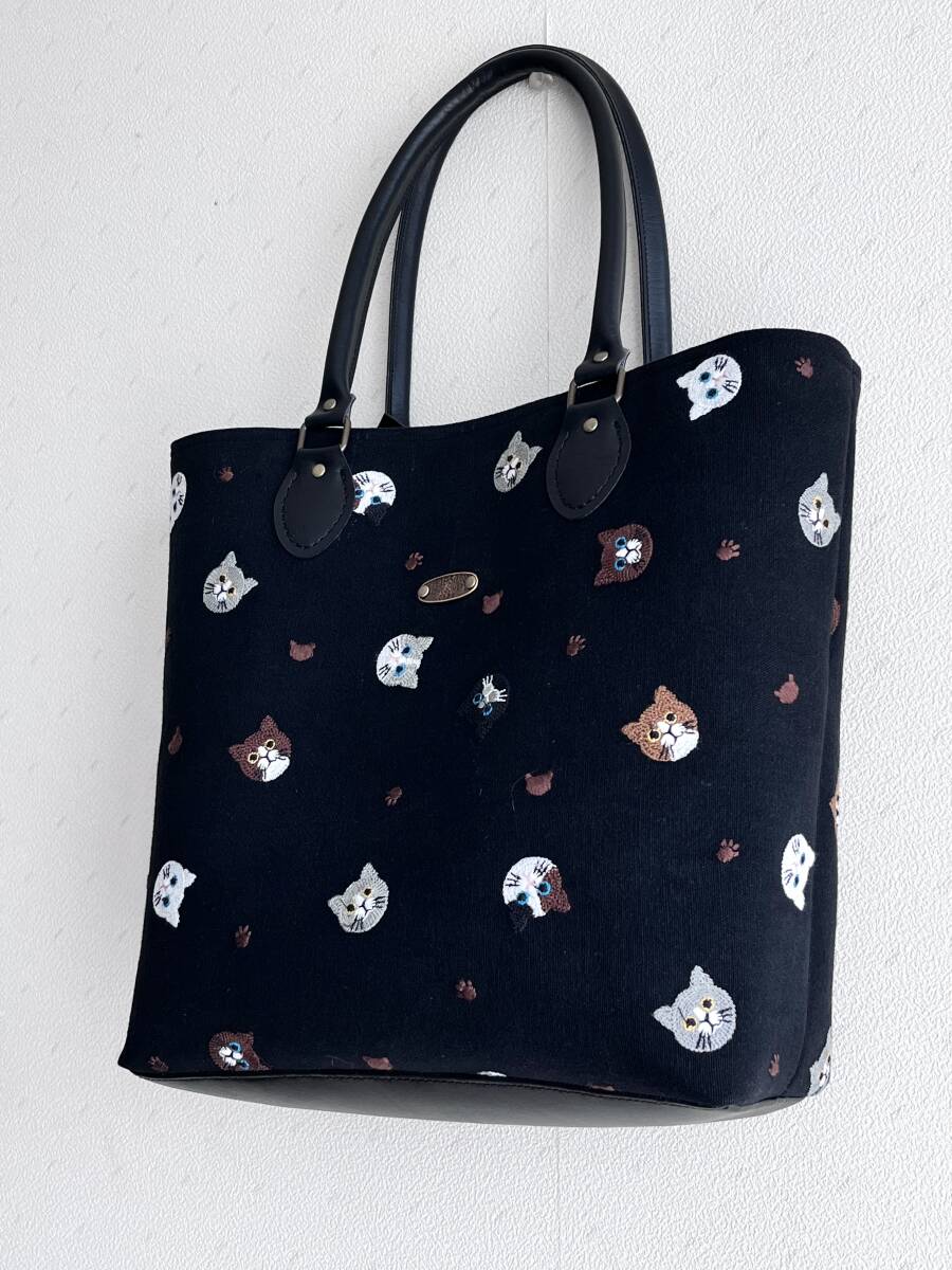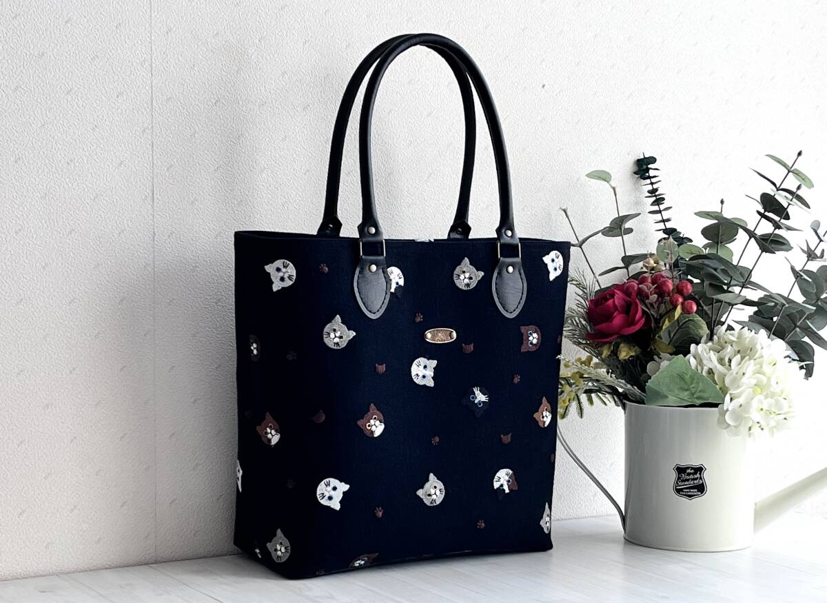 ハンドメイド+コットンリネン+手刺繍風+ネコ+ハチワレ+クロネコ+黒+大きめ+トートバッグ +ショルダーバック+樋口愉美子