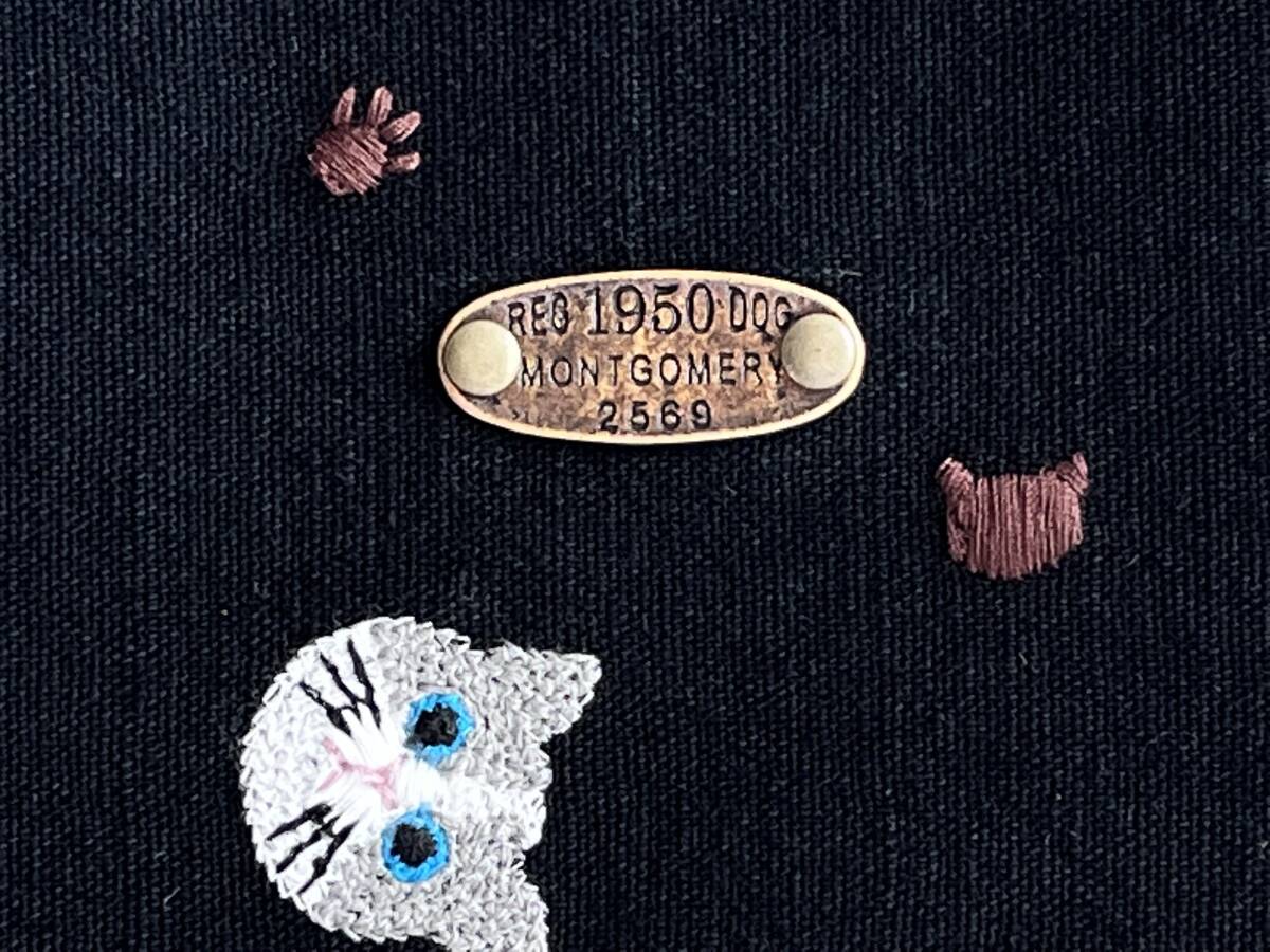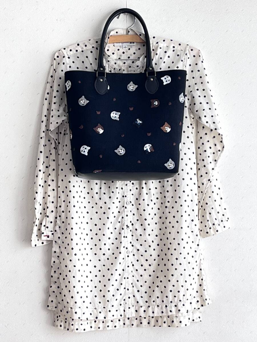 黒地のコットンリネンに様々なネコの刺繍が施された生地(黒)を使った