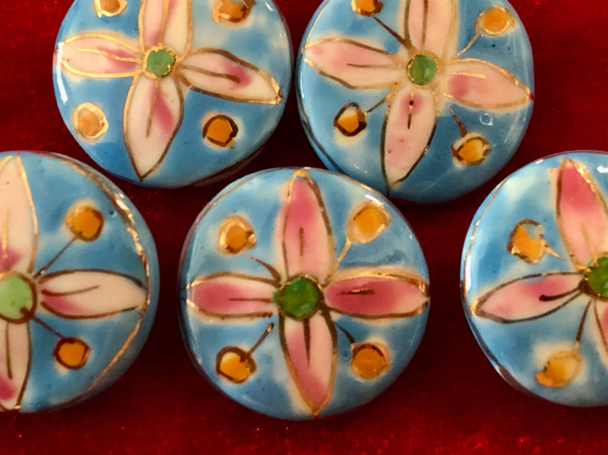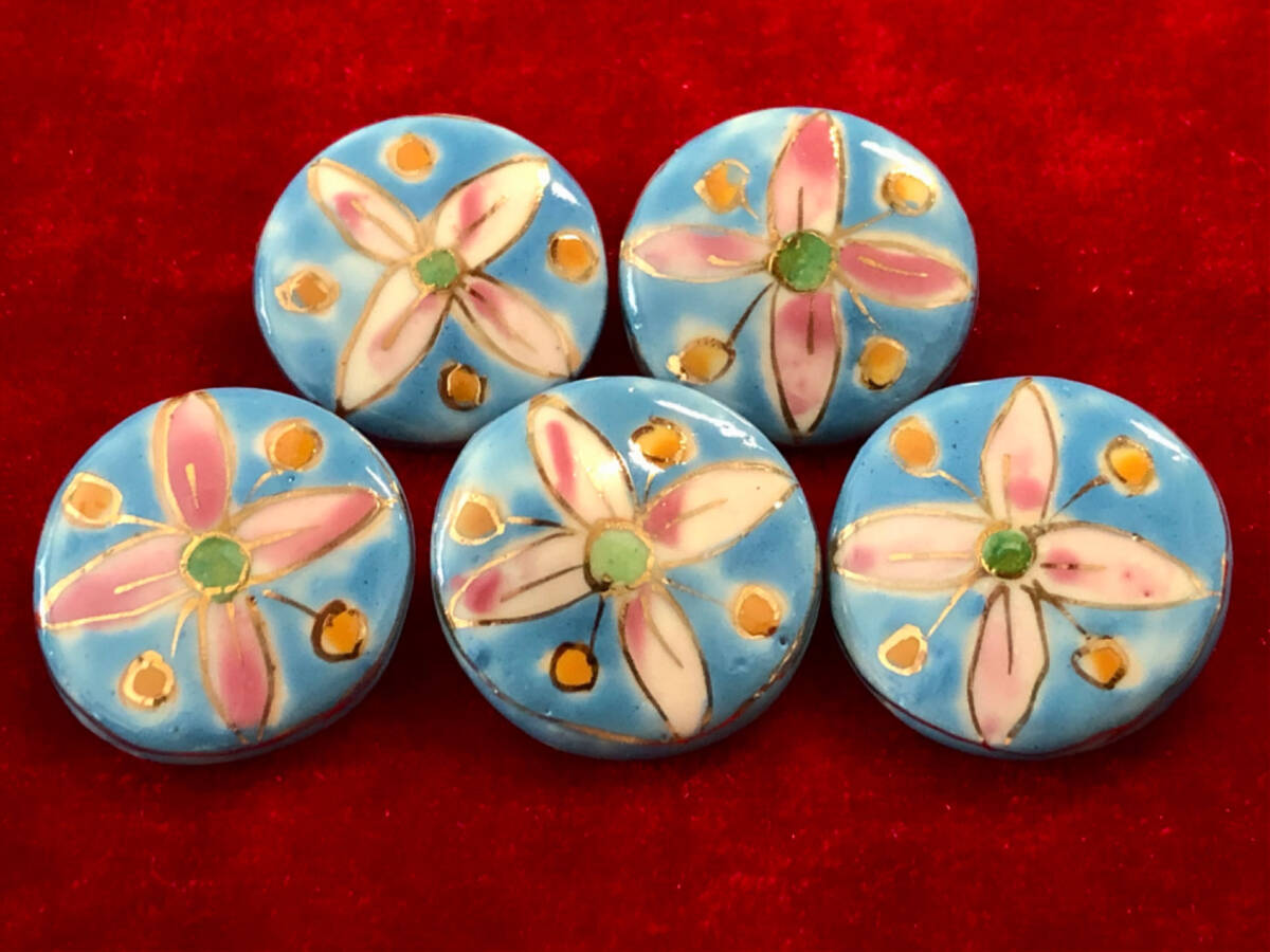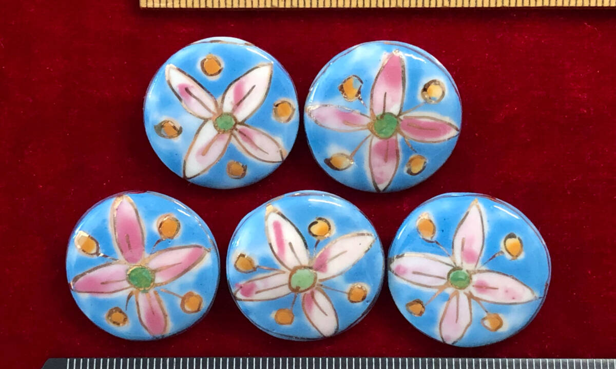 水色釉に 彩磁金粉縁取りの米型花模様大玉実用ボタン