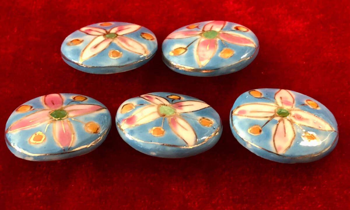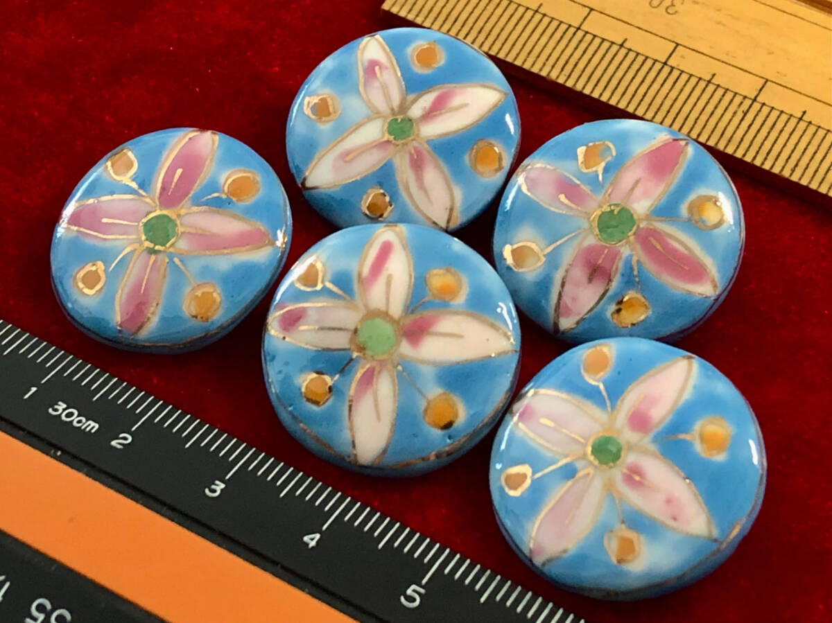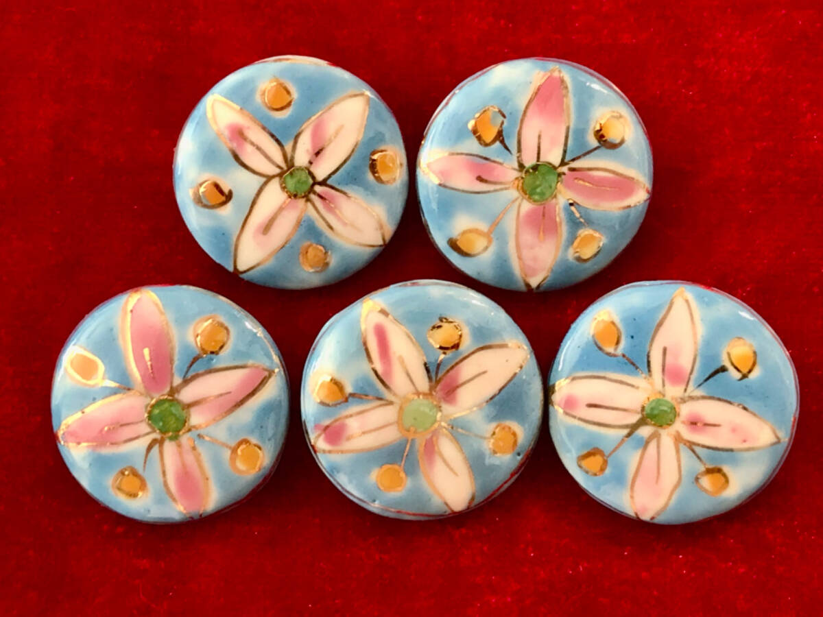 ¶!¶ 金粉彩磁ミニチュアワールド - 5個で1単位 ¶!¶ 約厚12㎜×Φ23㎜ 水色釉に彩磁金粉縁取り米型花 手作 手芸 縫製 服飾 インテリア