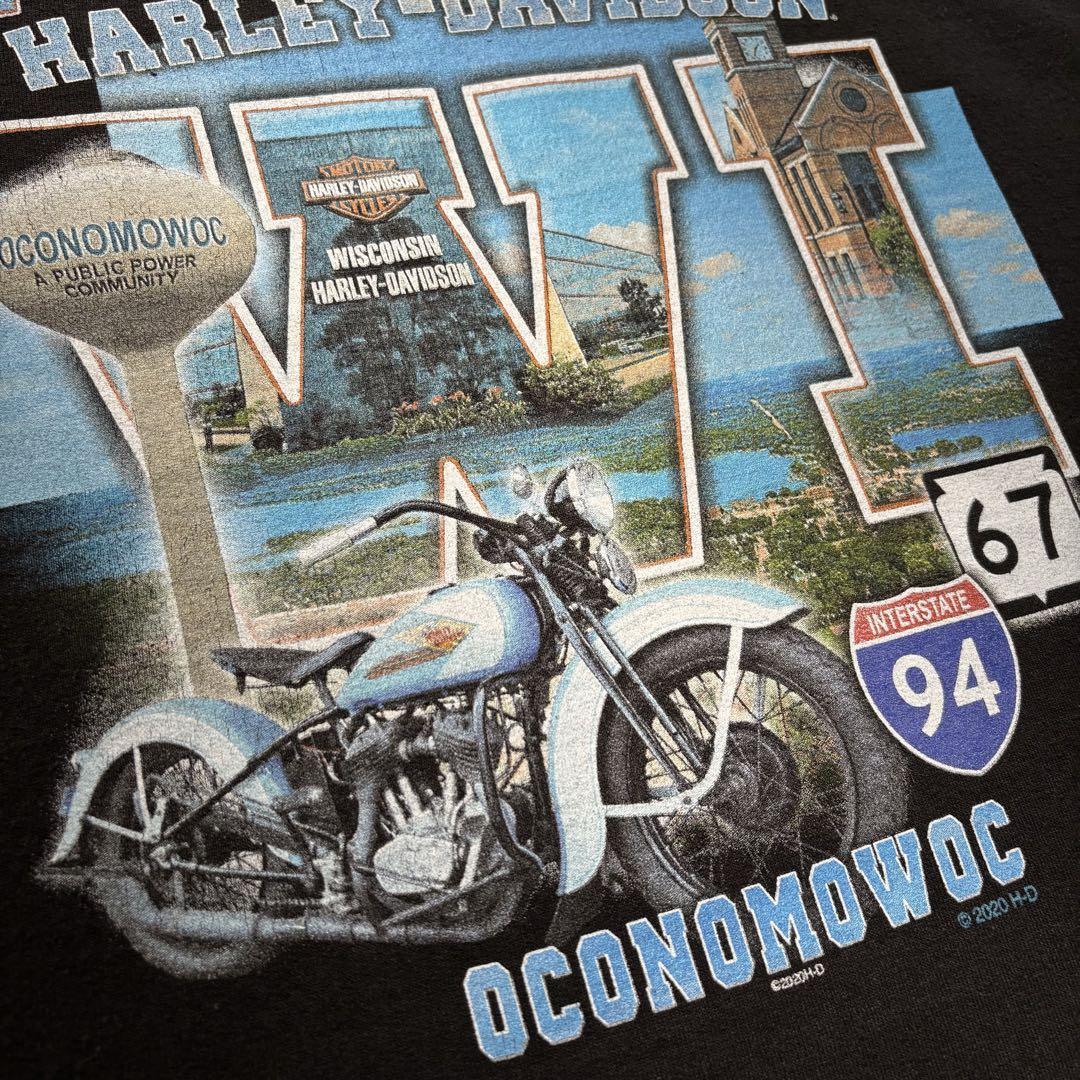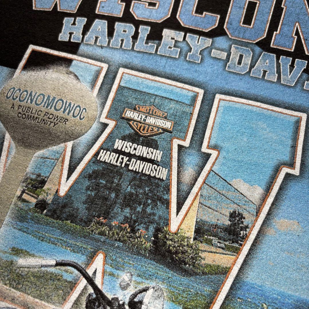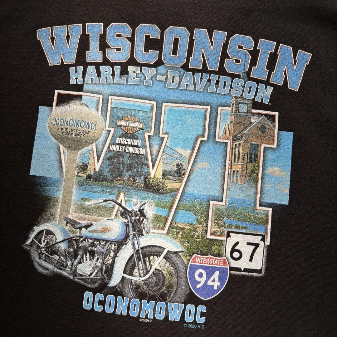 フロントはハーレー文字と定番ロゴ、バックプリントにはウィスコンシン州の街並み。