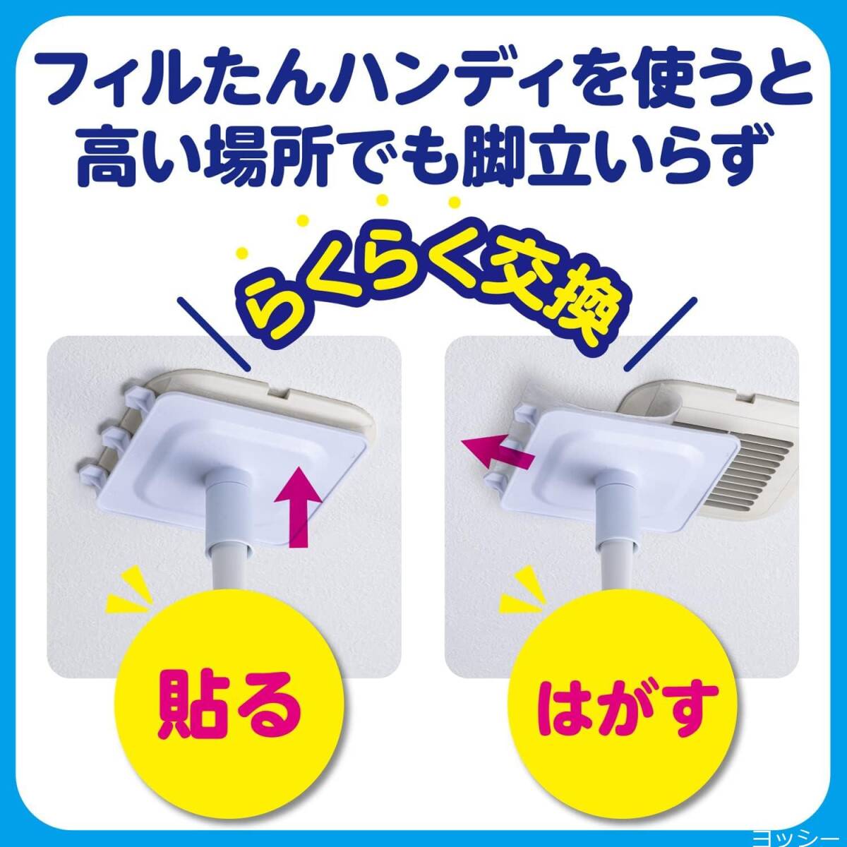 フィルたんハンディは、ジョイント部分にご家庭でお持ちのお掃除用ワイパー・モップなどの柄(付属せず)を差し込むことで、天井の換気扇へホコリとりフィルターを取付け、取り外しが行える補助具です。