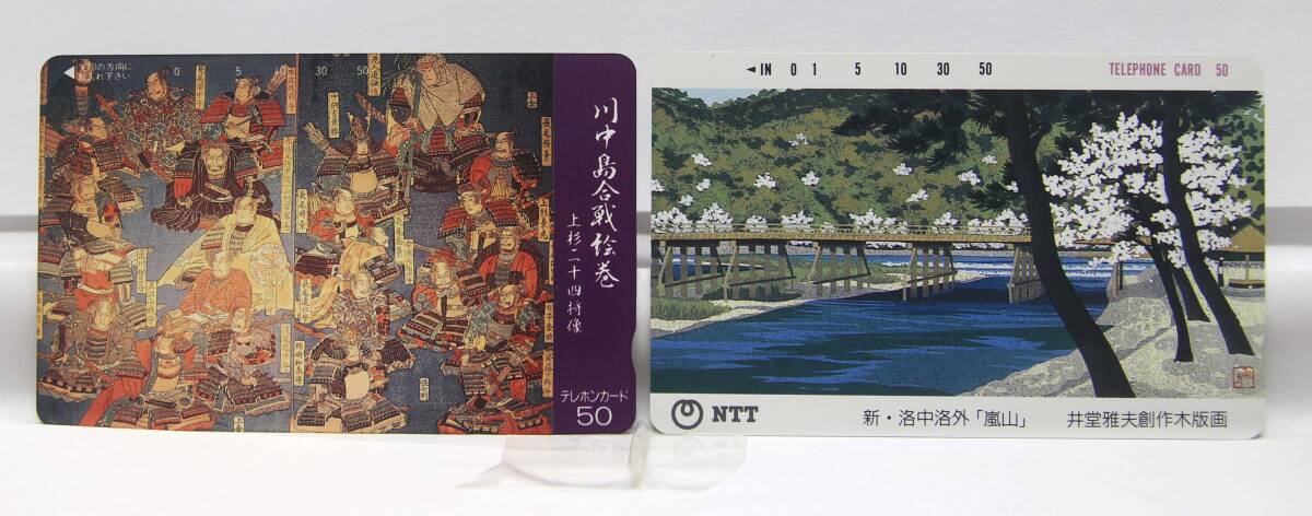 【戦国絵巻 × 風景版画 テレホンカード 2枚セット】 川中島合戦絵巻(上杉二十四将)」、井堂雅夫氏の木版画「嵐山」