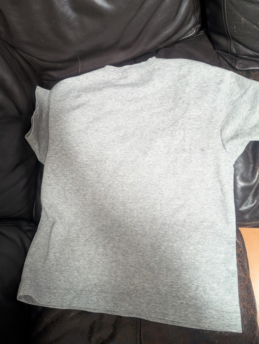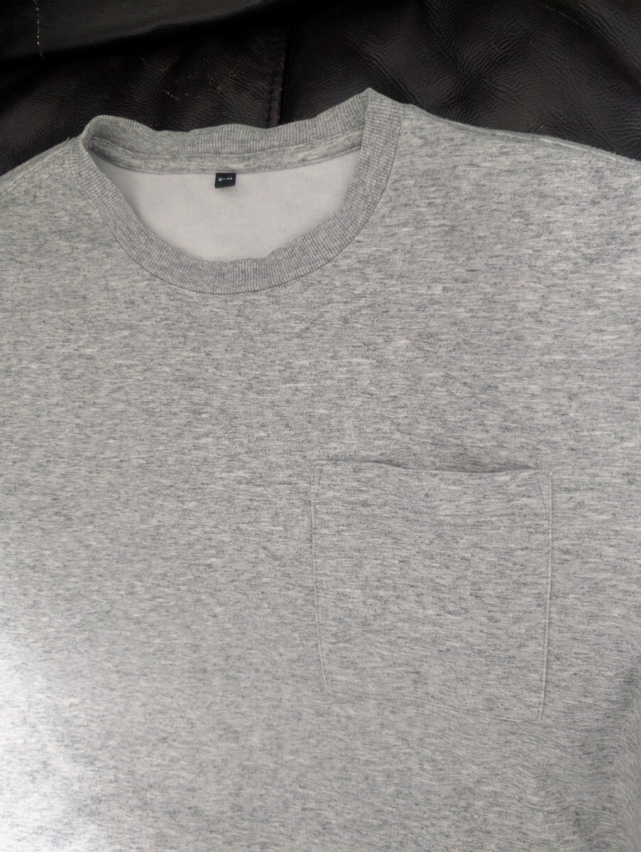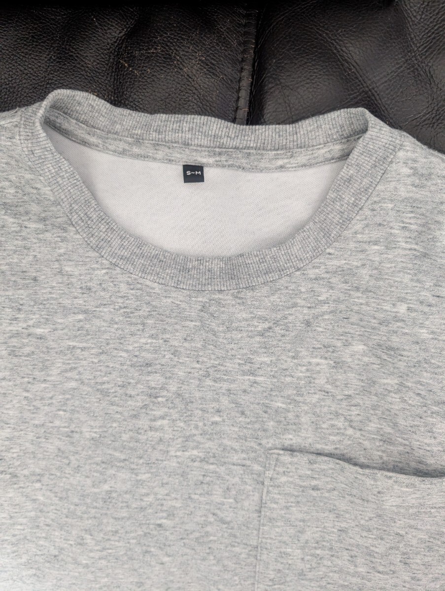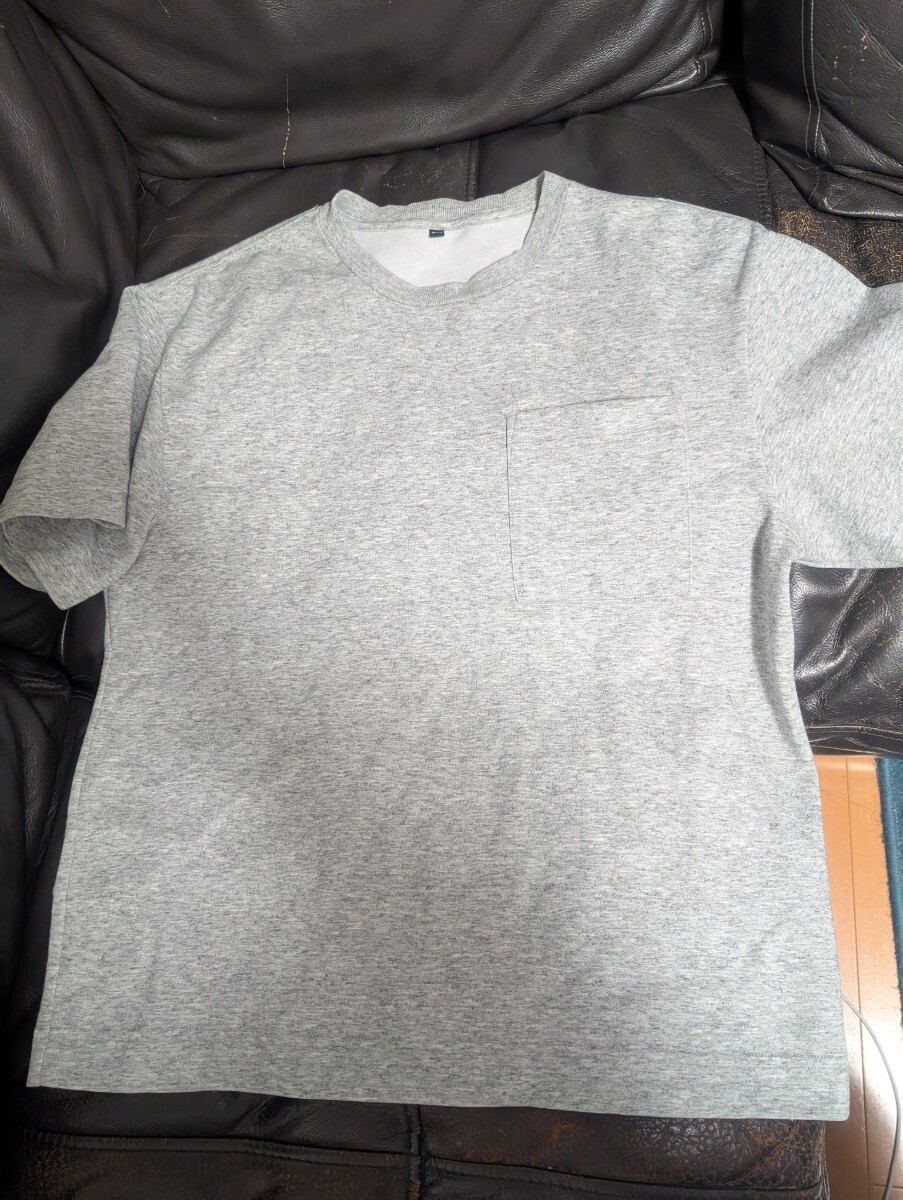 お色はグレー、霜降りがかっています。胸ポケットあり、SМですが、オーバーサイズで、普通のTシャツのМ位です。