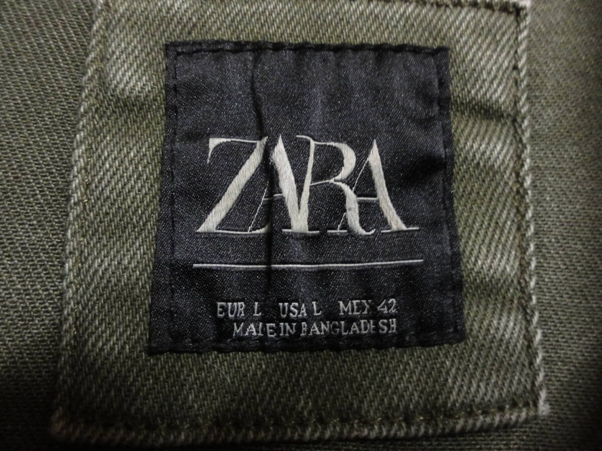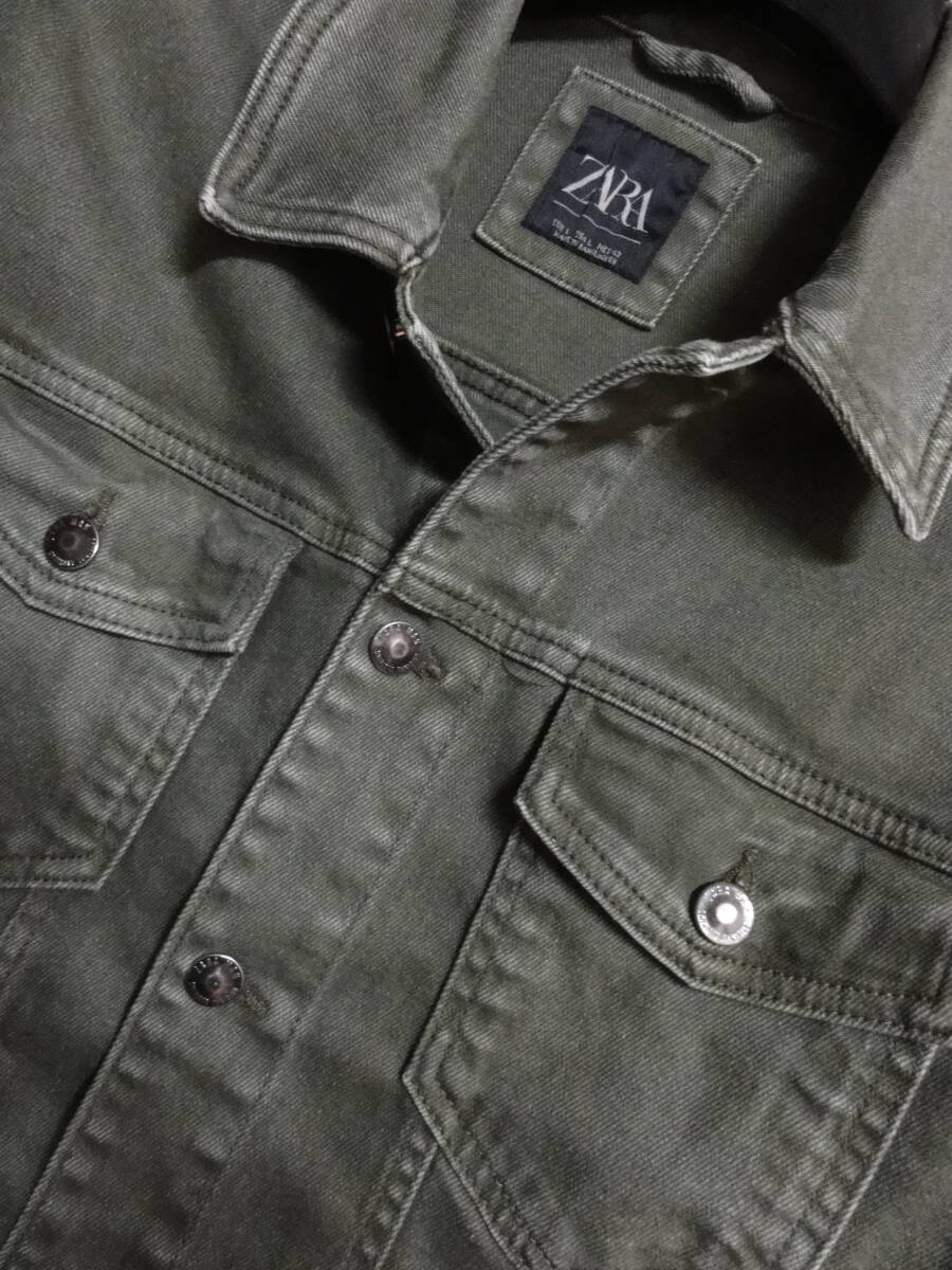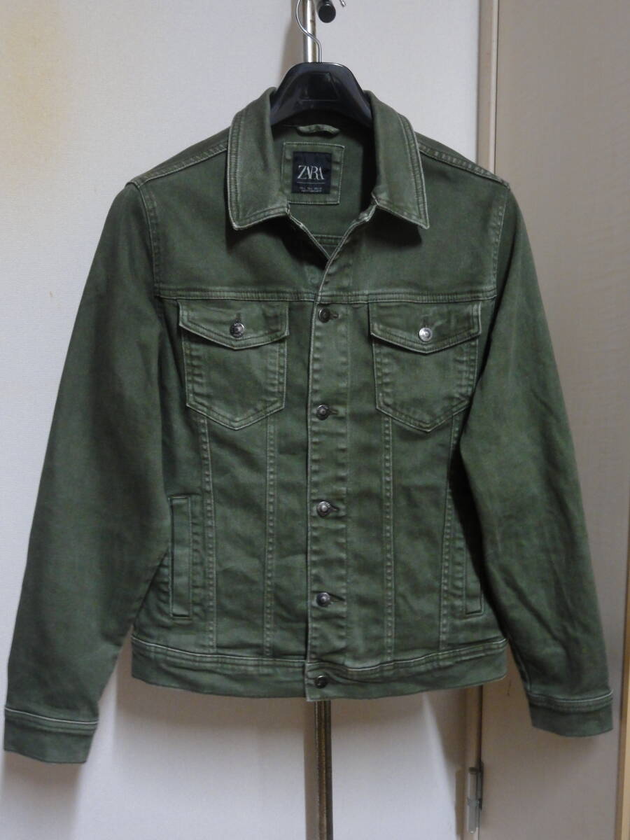 人気ブランド ZARA(ザラ)のお洒落で希少なアーミー風グリーンカーキ系ダメージ加工デニム地・高級ジージャン系ブルゾンタイプのかっこいいレアモデルです。