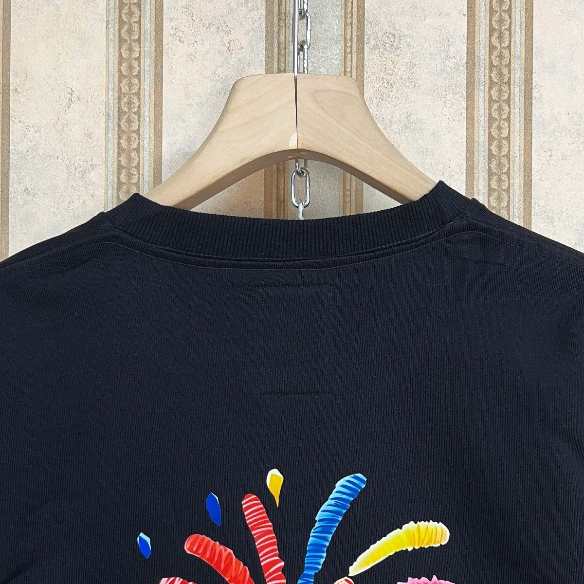 ゆったりとしたクラシックなシルエットで、着心地も抜群。胸元には控えめながら存在感のあるカラフルな花火プリントを配置します。背面いっぱいに広がる花火プリントが目を引き、シンプルでありながら圧倒的な個性を放ちます。体にフィットするリブ仕様の裾や袖口が、動きやすく快適な着心地を実現します。